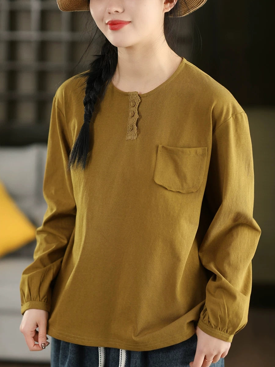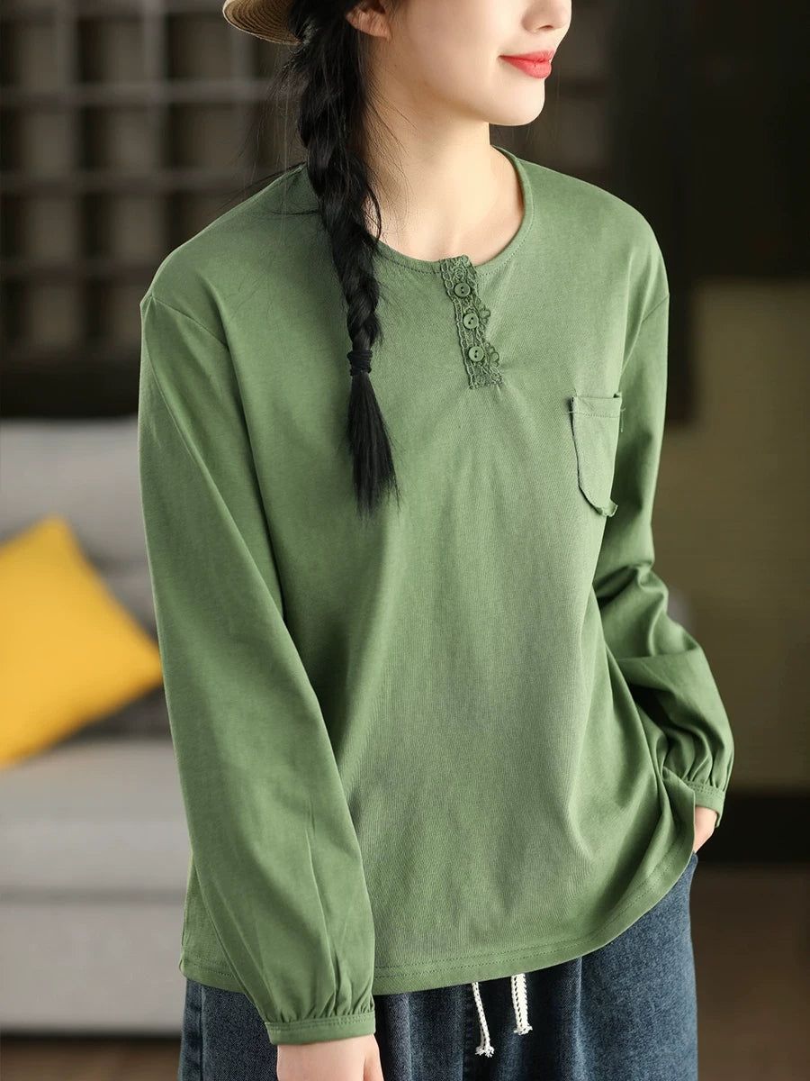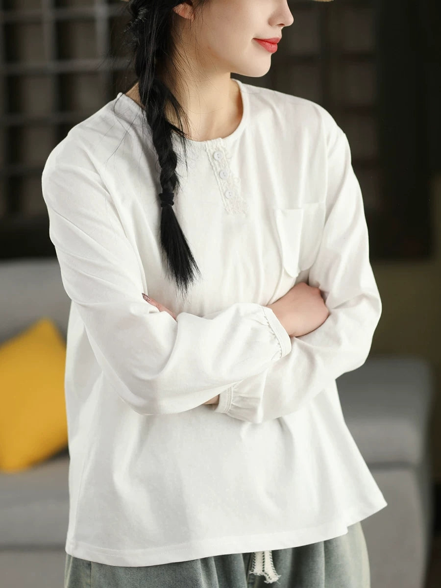 Damska bluzka z okrągłym dekoltem w artystycznym, wiosennym stylu z czystej bawełny