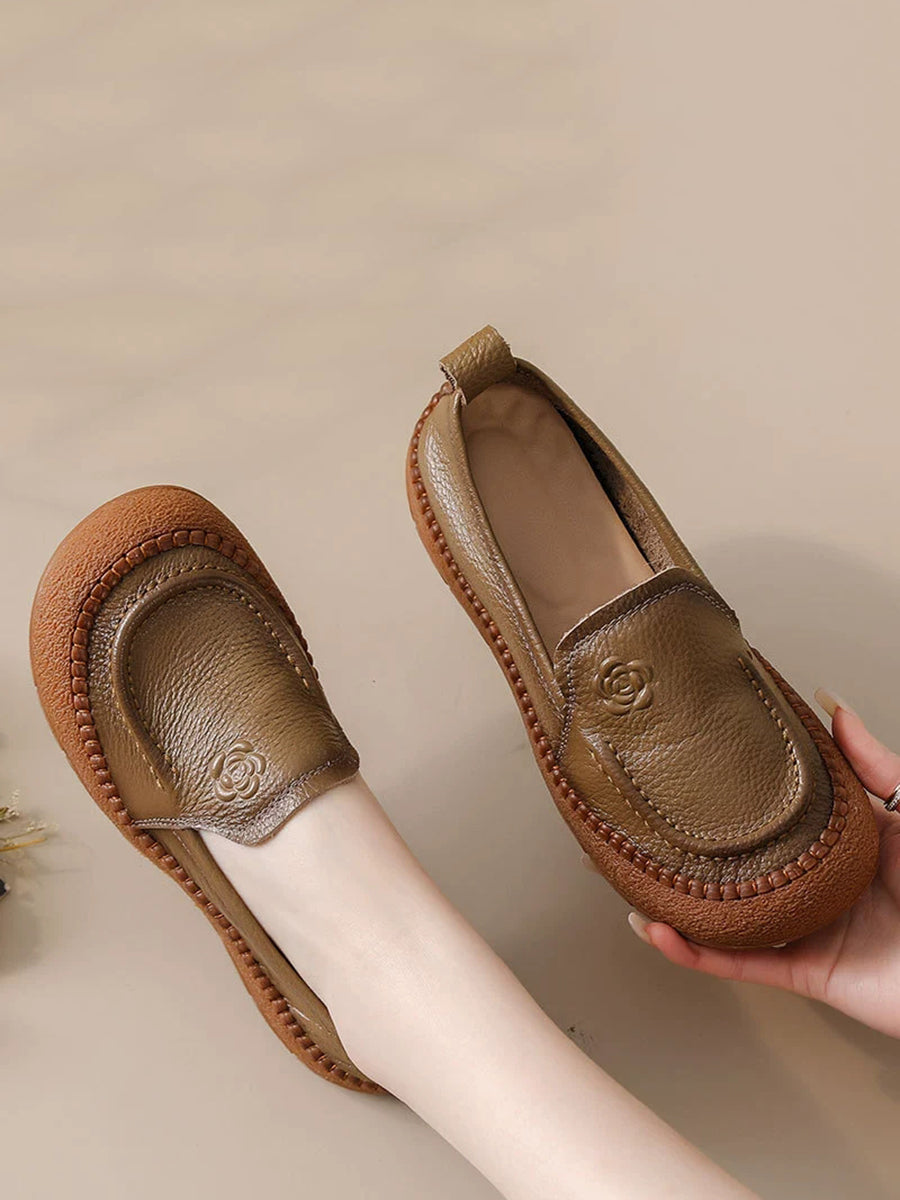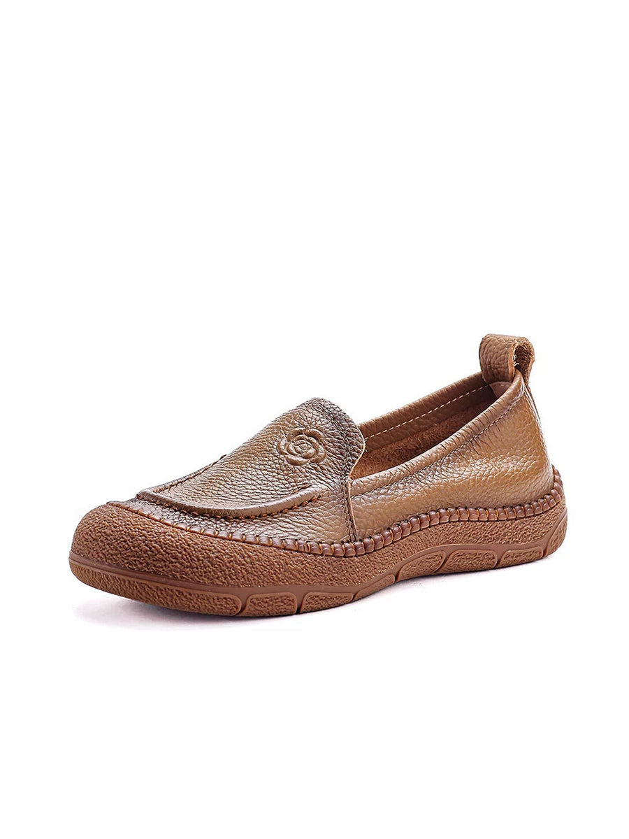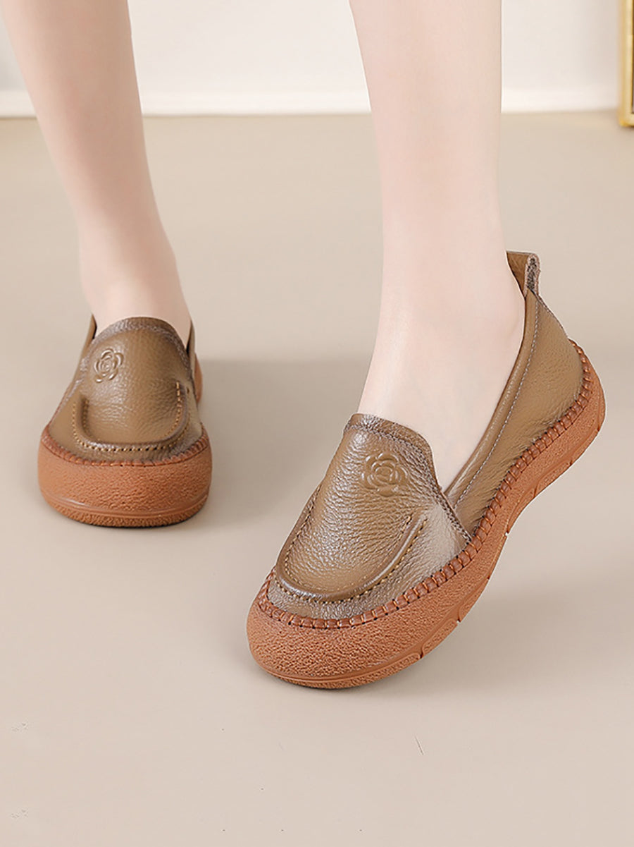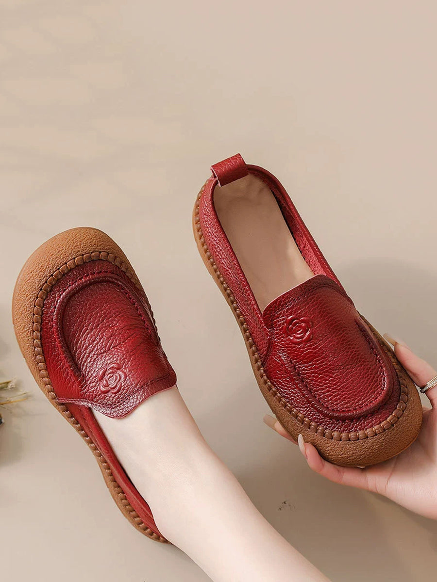 Damskie wiosenne, skórzane, płaskie buty z wytłoczonym kwiatem