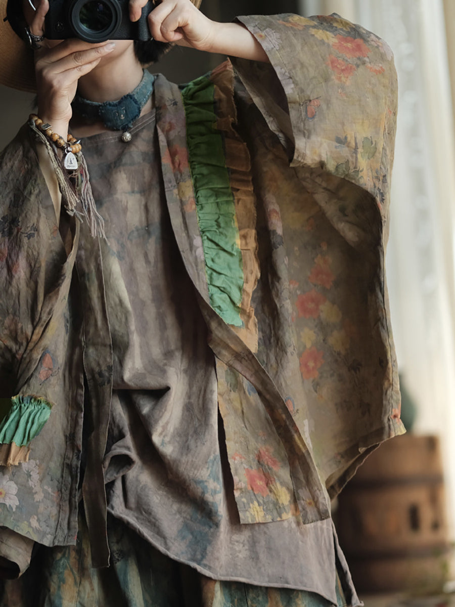 Koszula lniana damska letnia retro z kwiatowym wzorem w bloki kolorów i dekoltem w serek