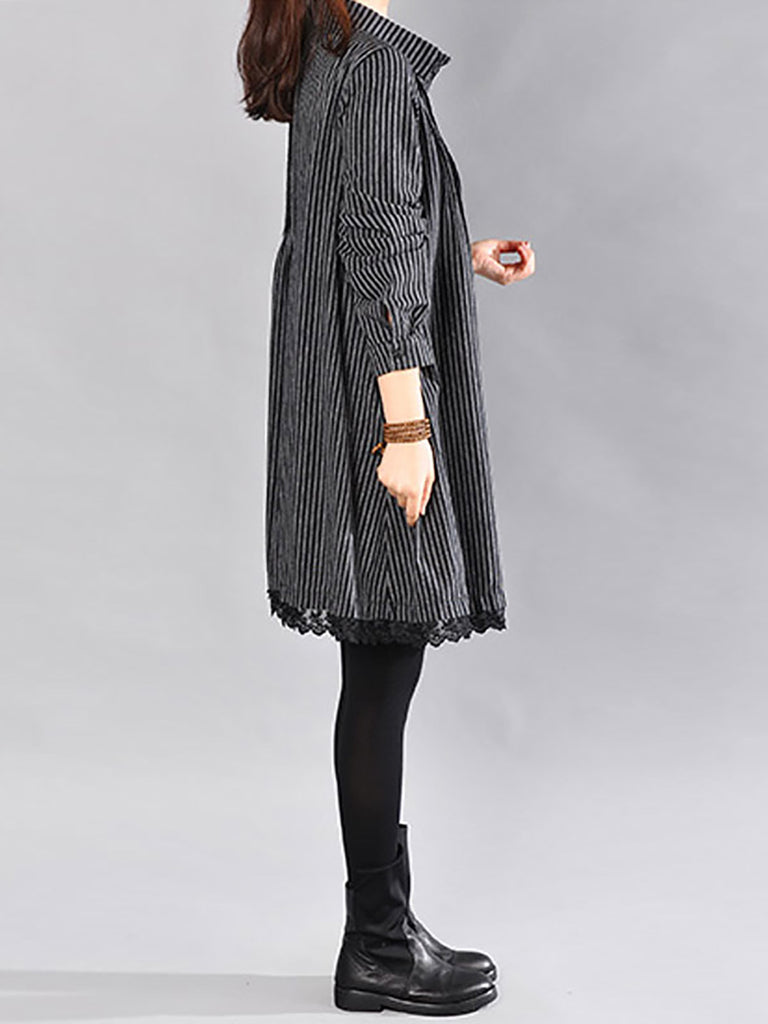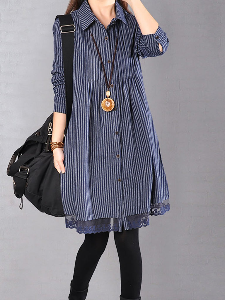 Plus Size Loose Cotton Linen Printing Lace Hem Dress