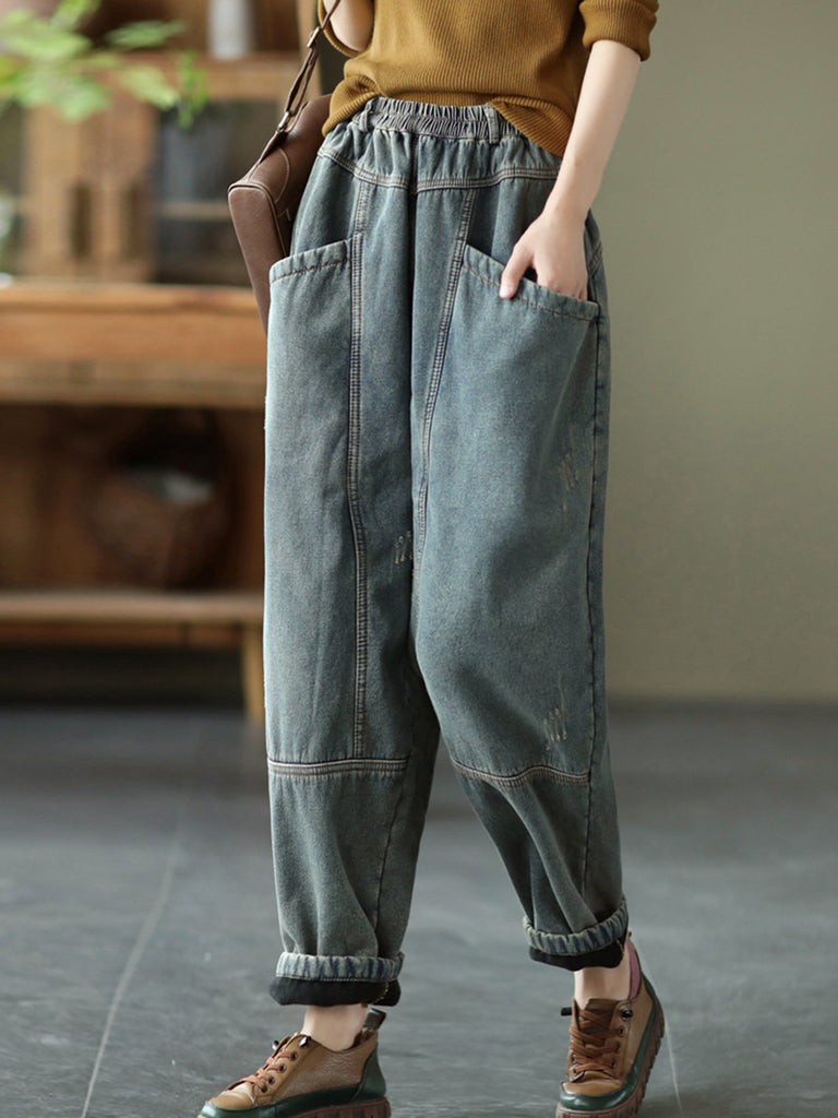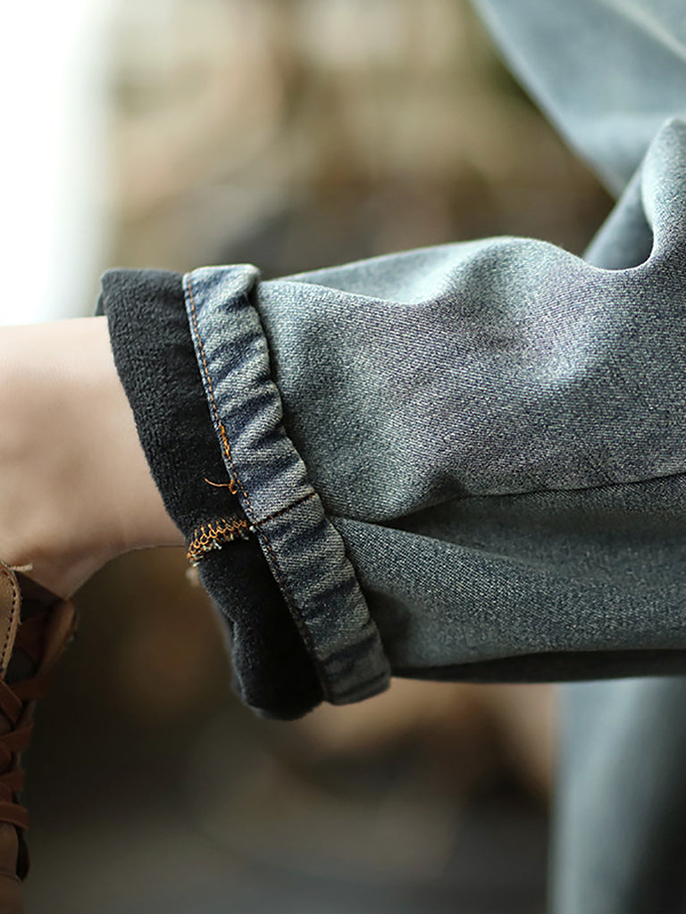 Plus Size Women Retro Spliced Denim Fleece-lined Pants