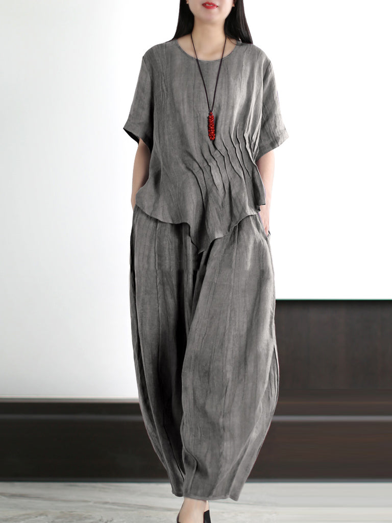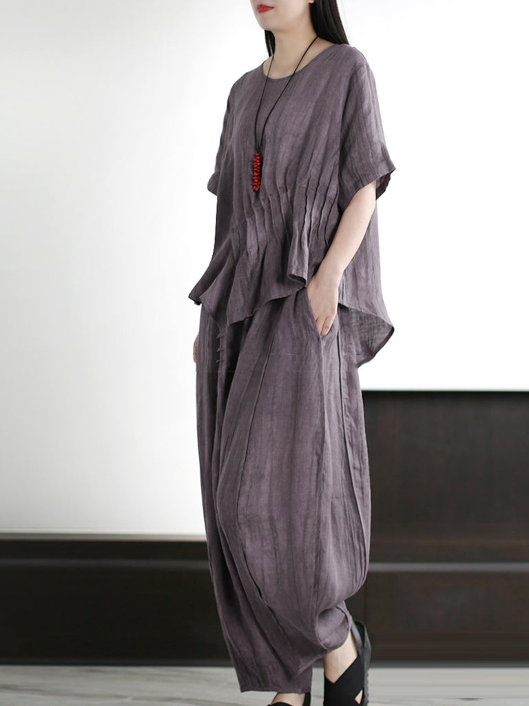 Plus Size Women Vintage Solid Linen Cotton Shirt+Pants