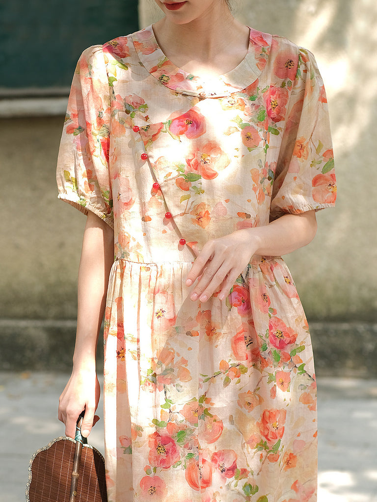 Plus Size Women Vintage Summer Floral Button Loose Ramie Dress