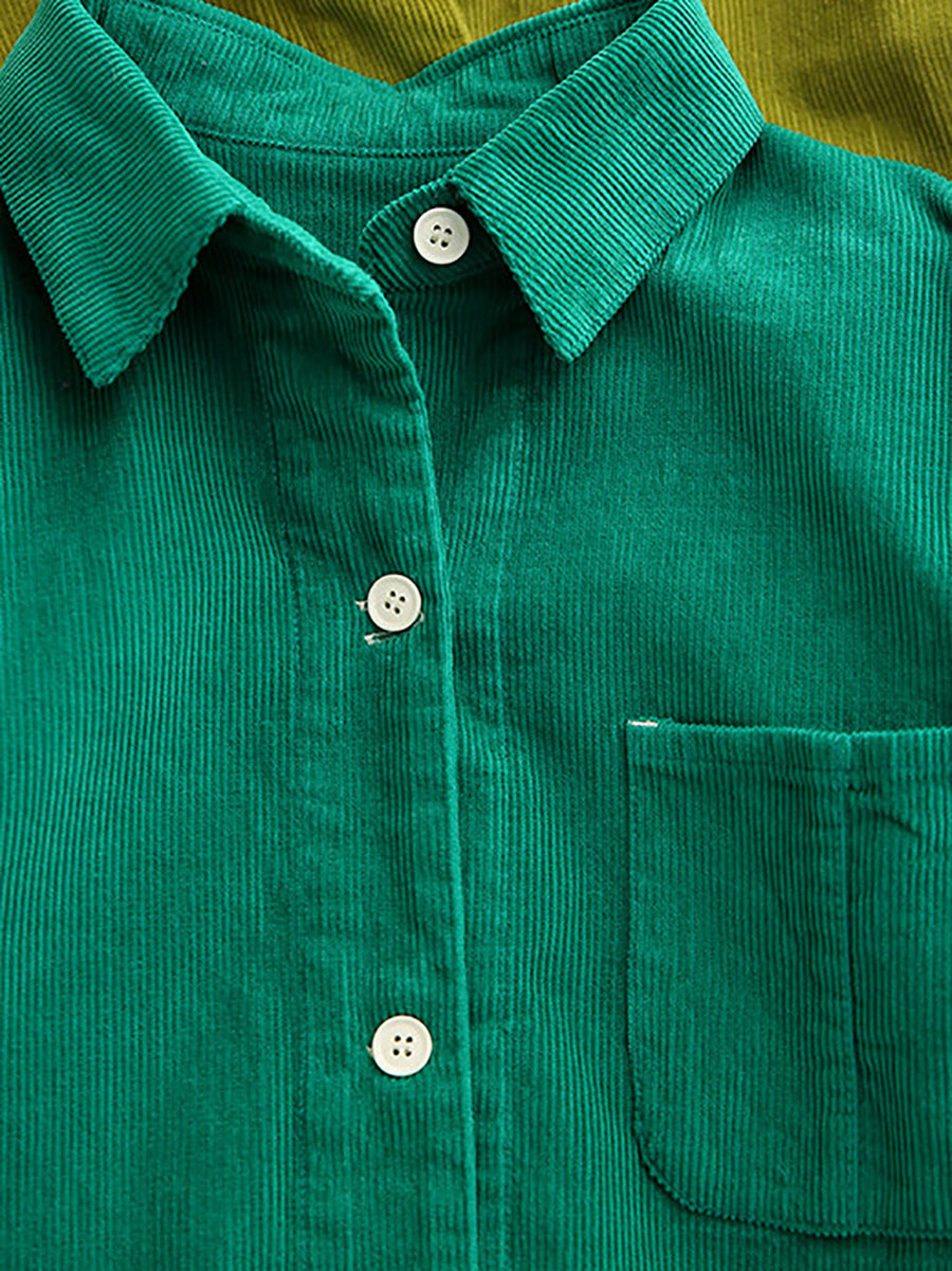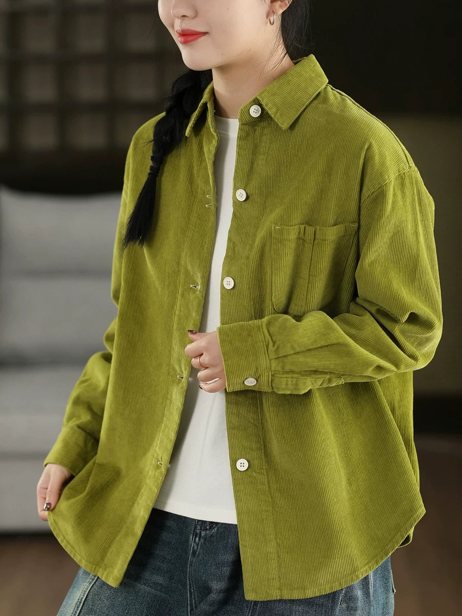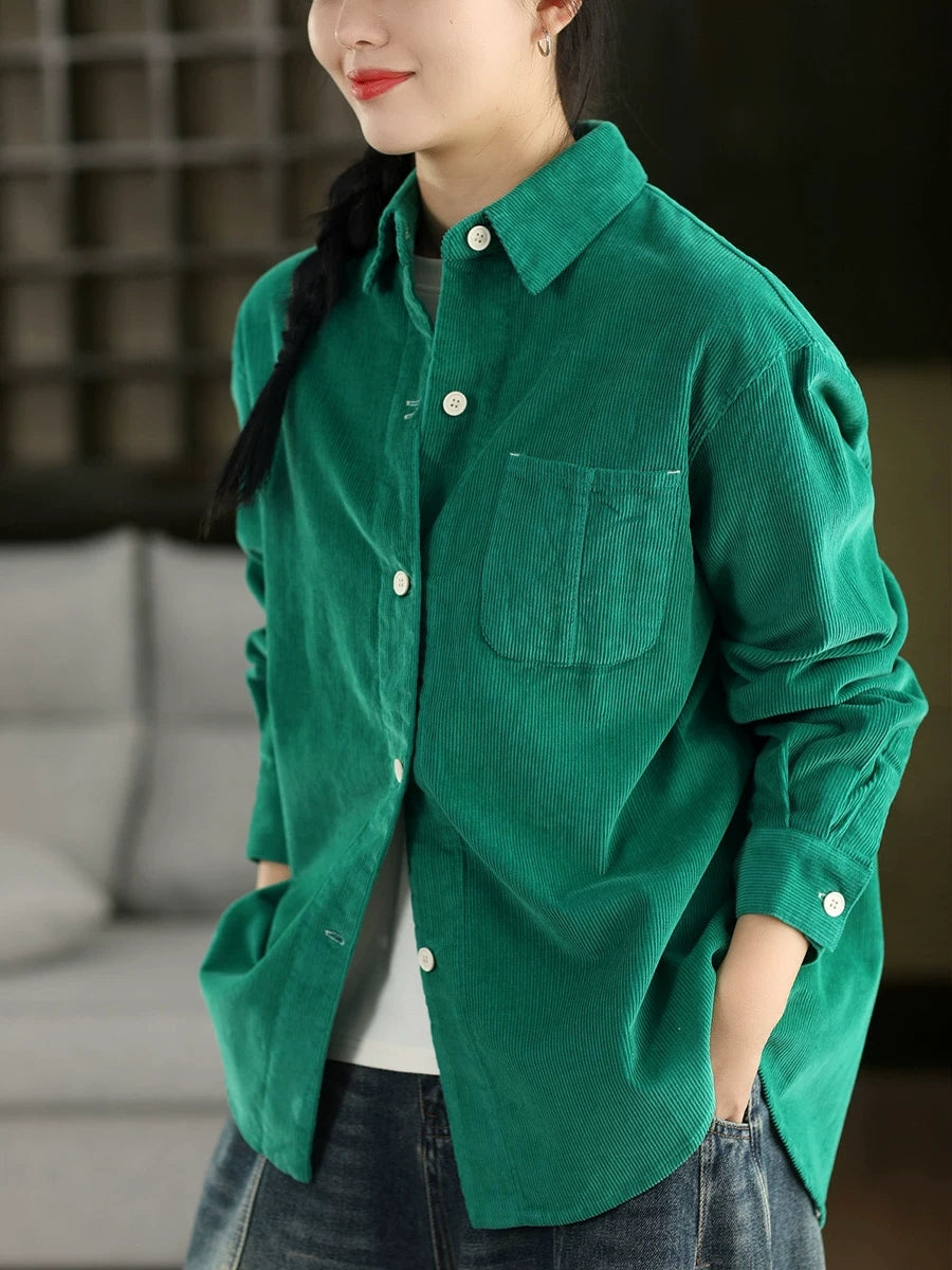 Women Retro Spring Pure Color Corduroy Turn-down Collar Shirt