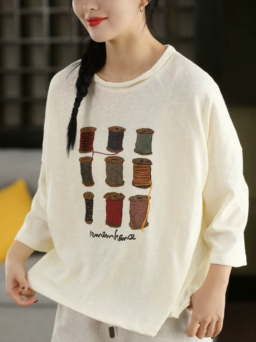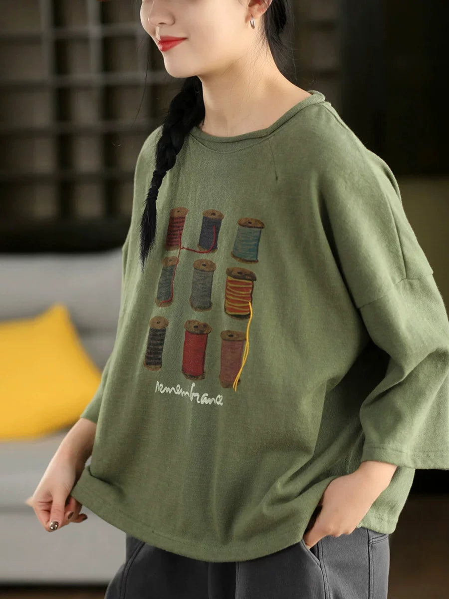 Women Spring Artsy Print Cotton O-Neck Blouse
