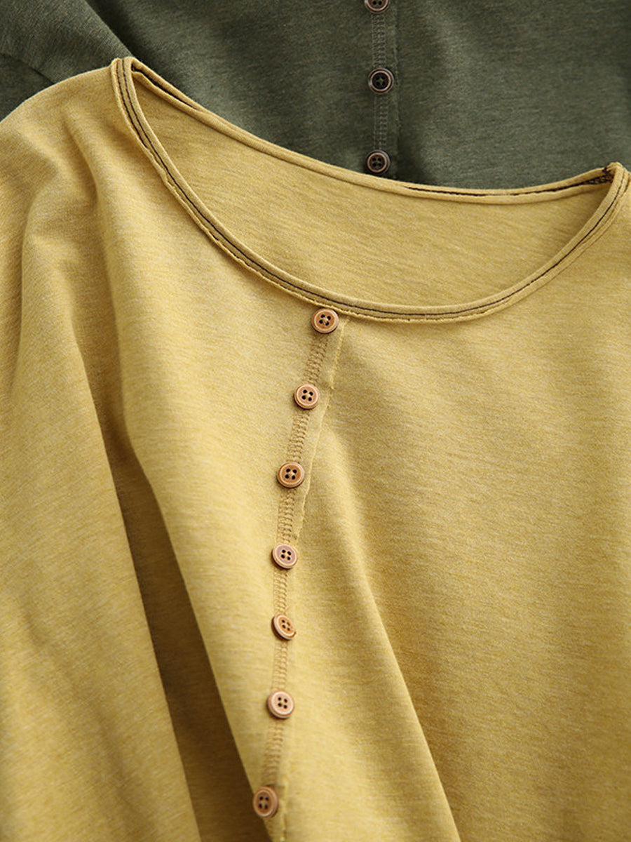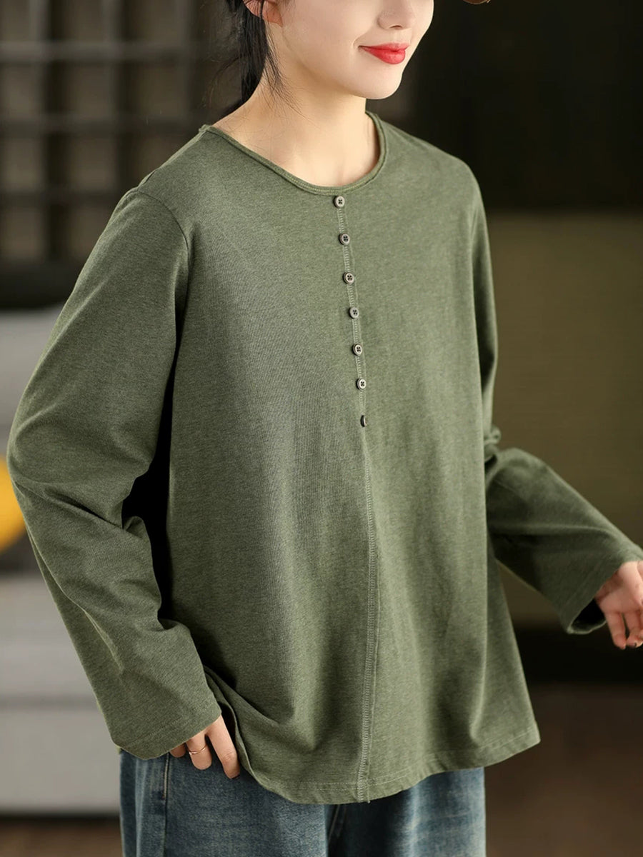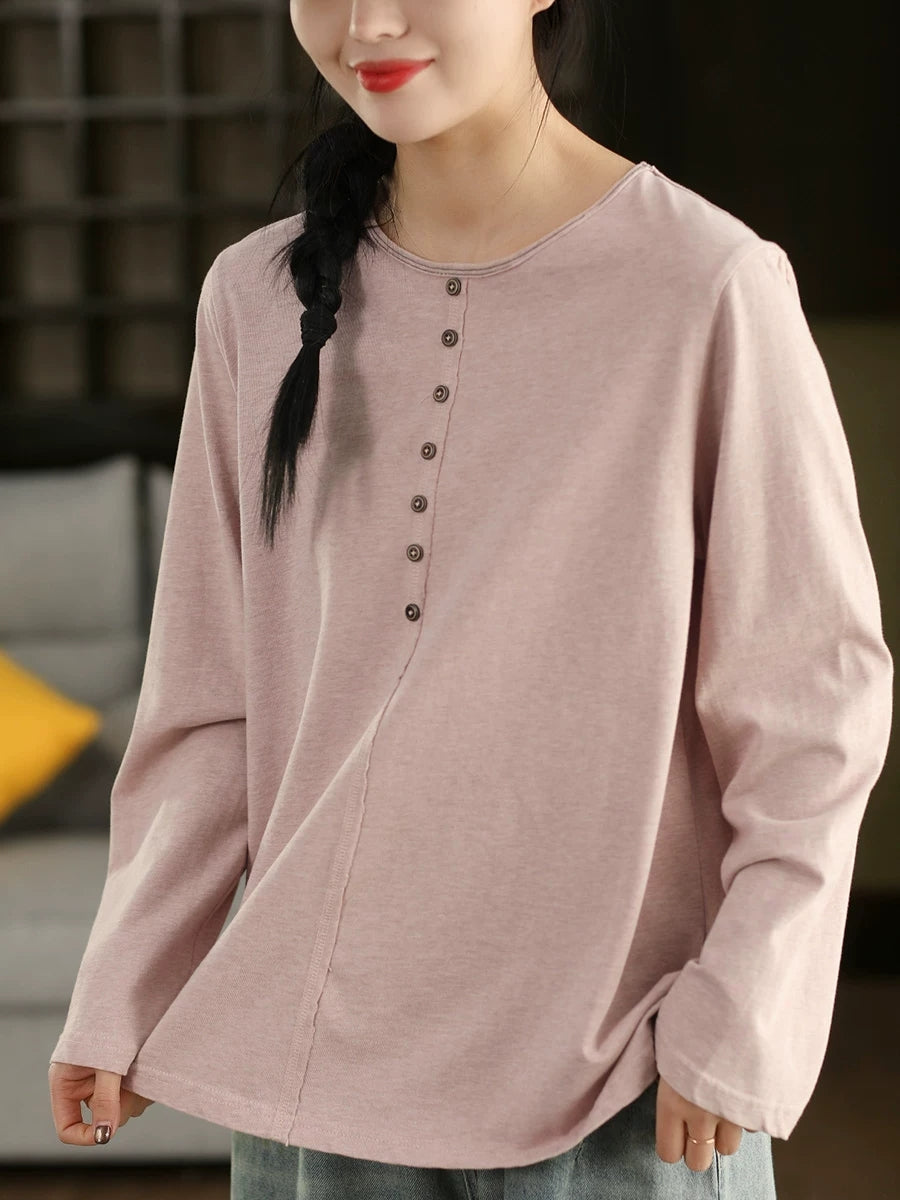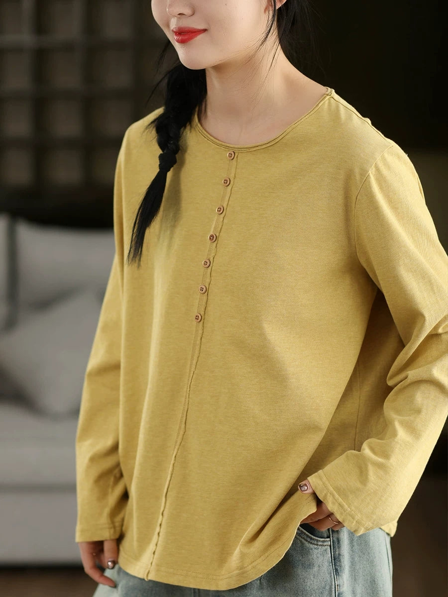 Women Spring Artsy Pure Color 100%Cotton O-Neck Blouse