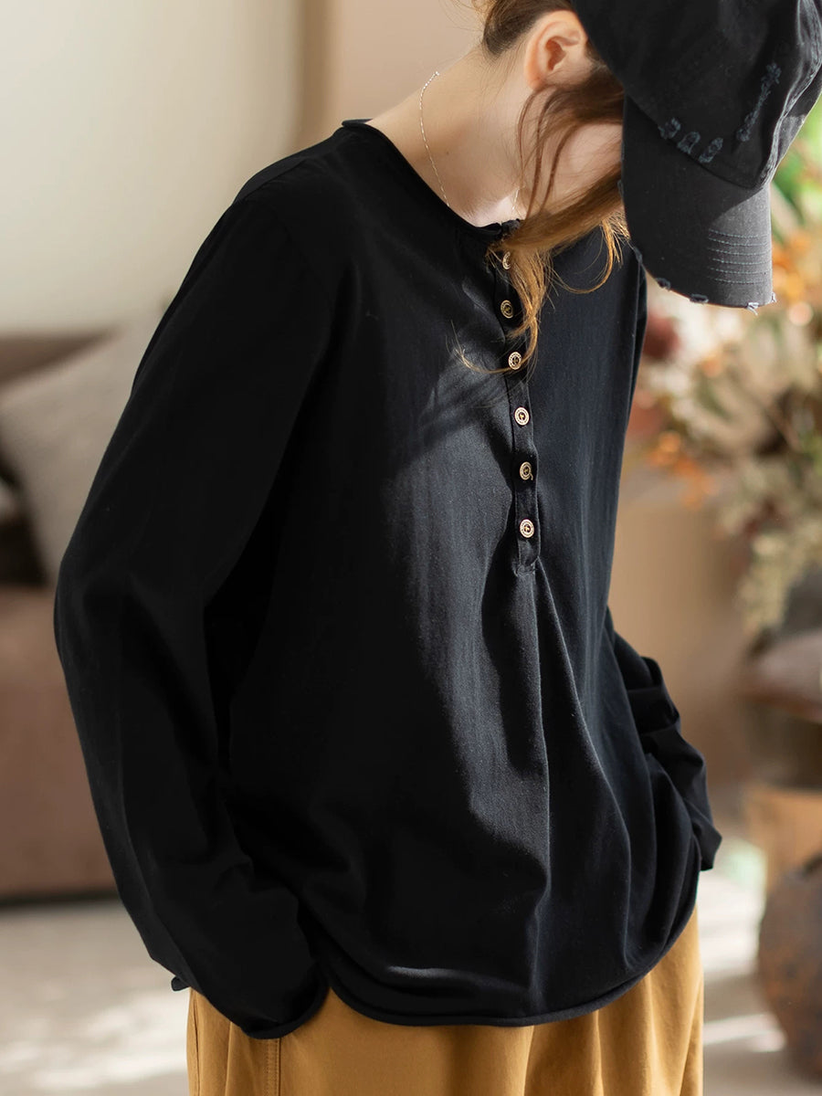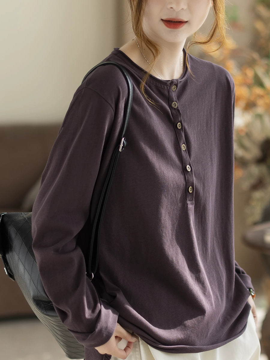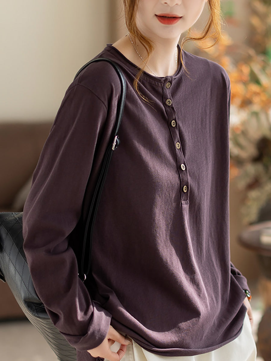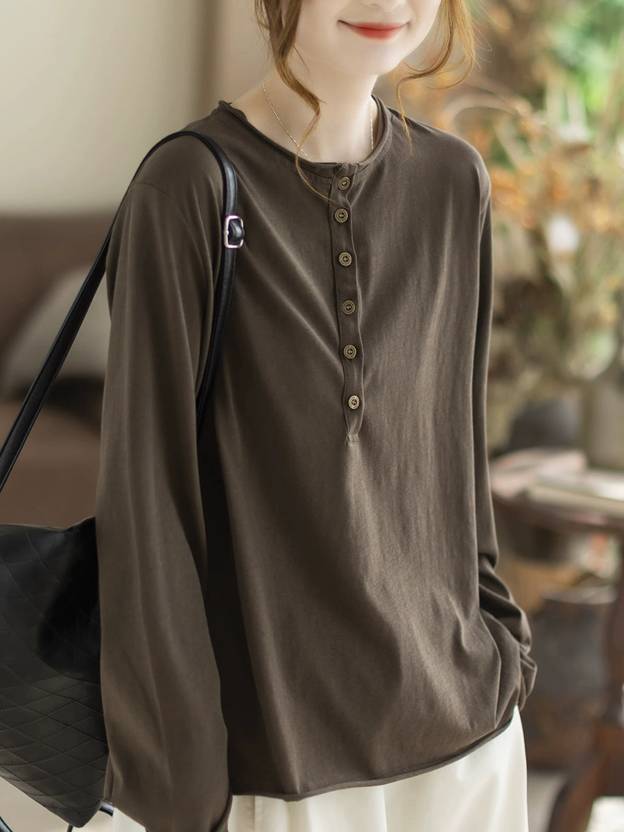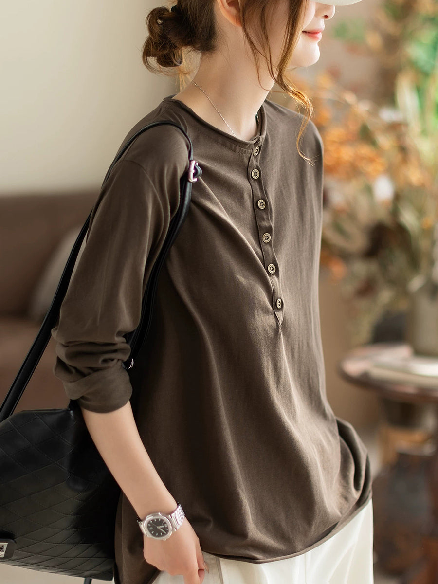 Women Spring Artsy Pure Color Cotton O-Neck Blouse