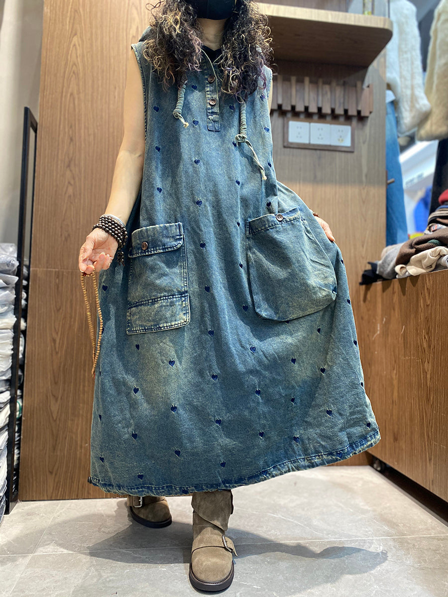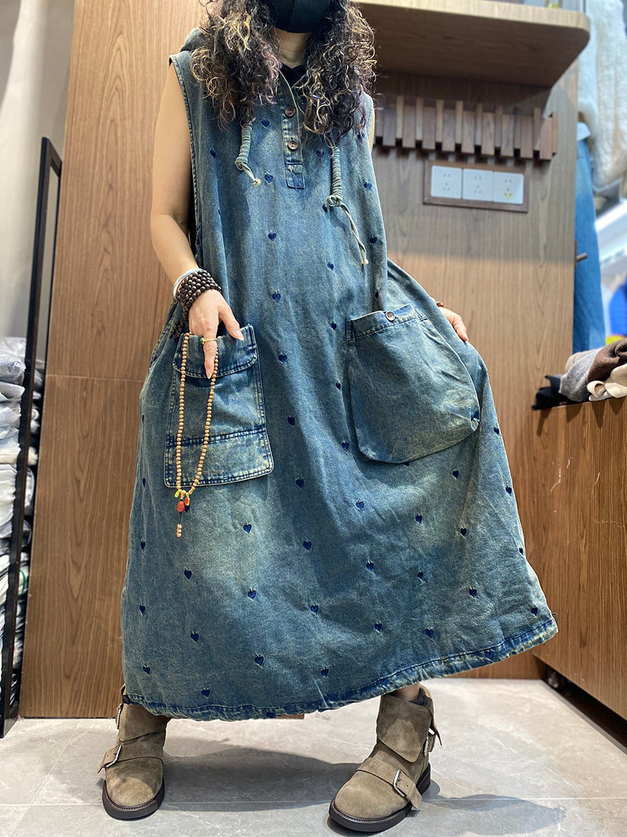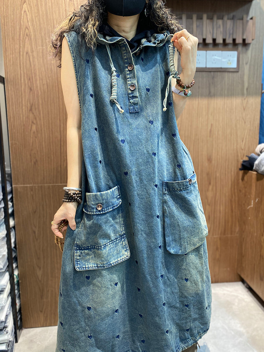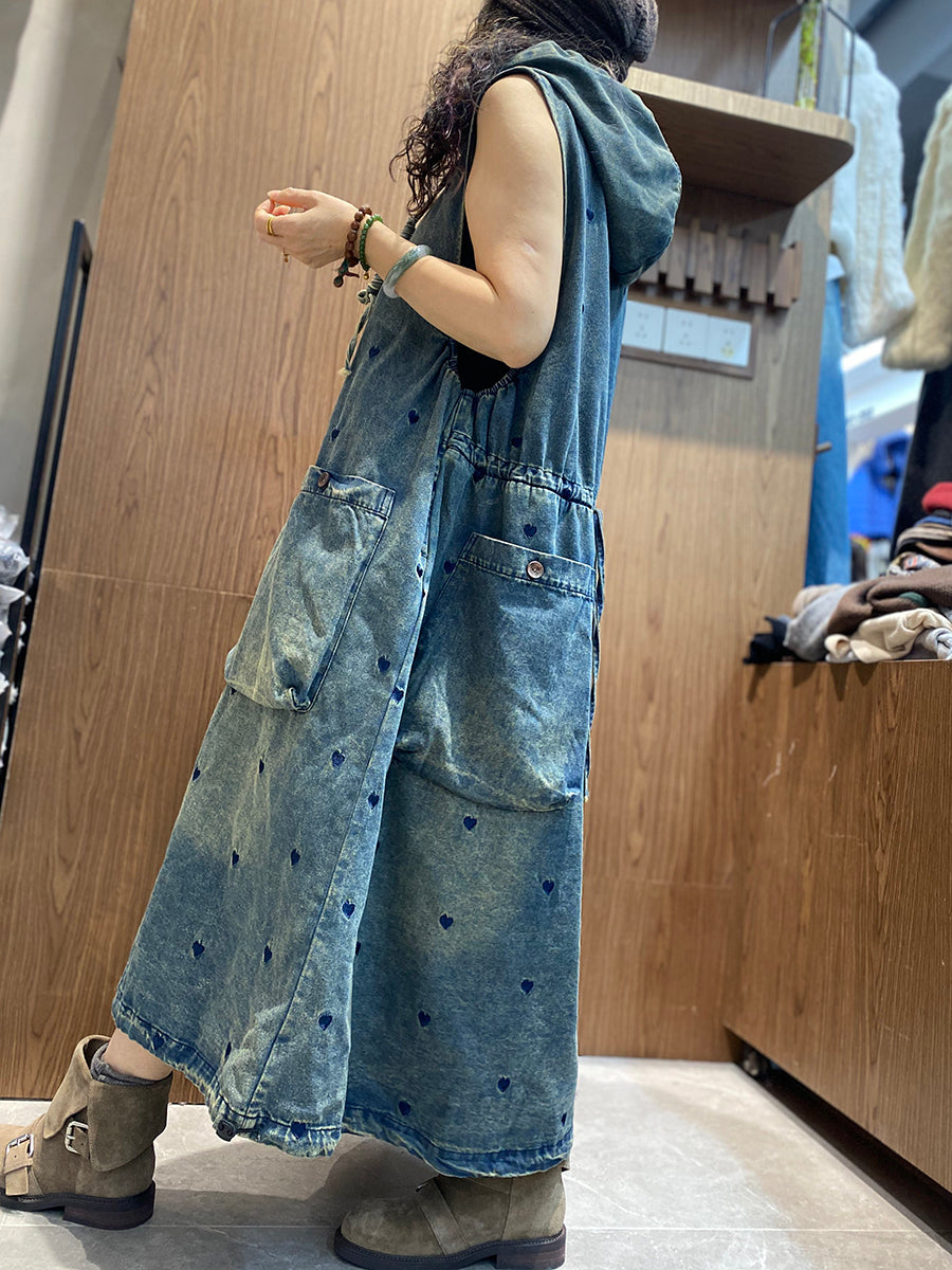 Women Spring Heart Embroidery Denim Hooded Vest Dress