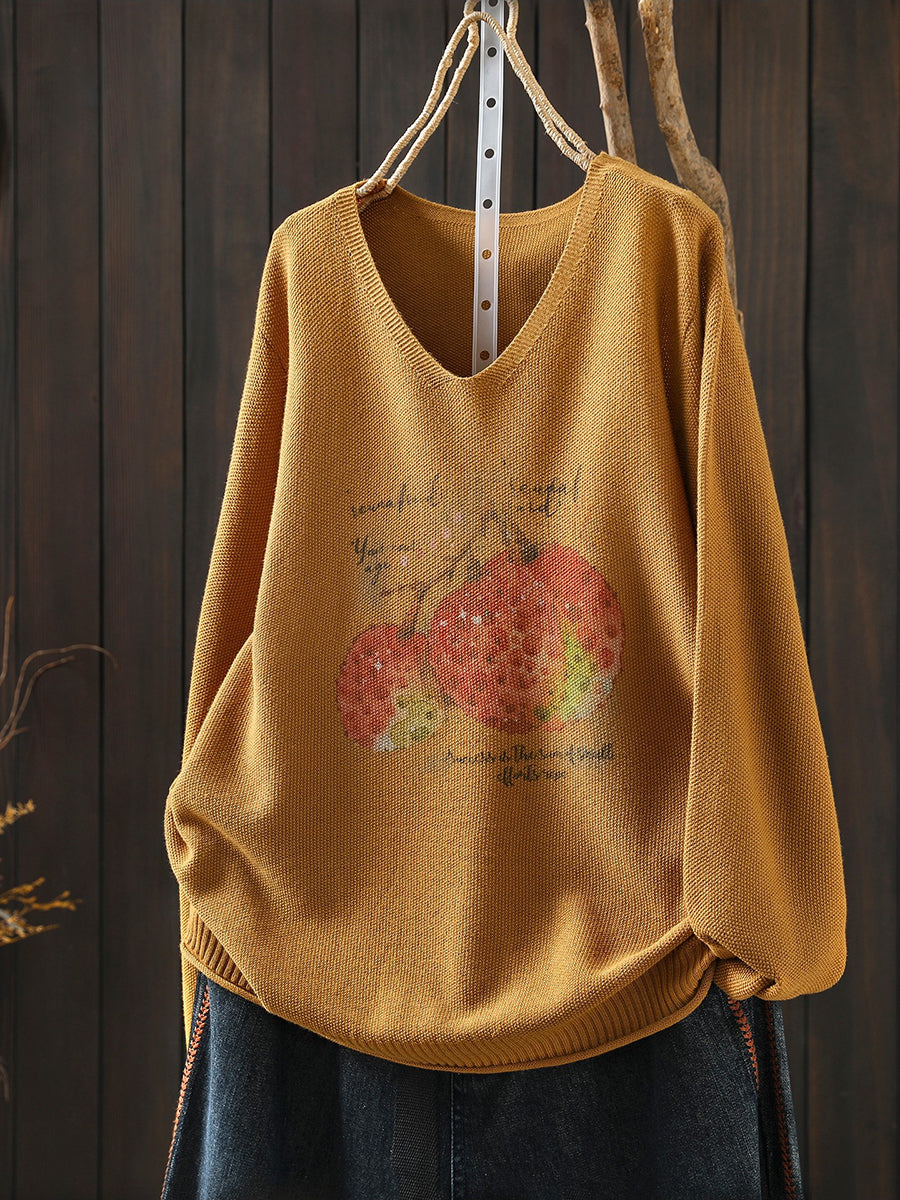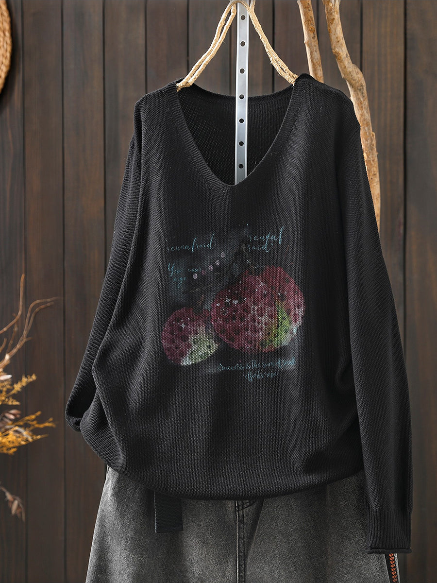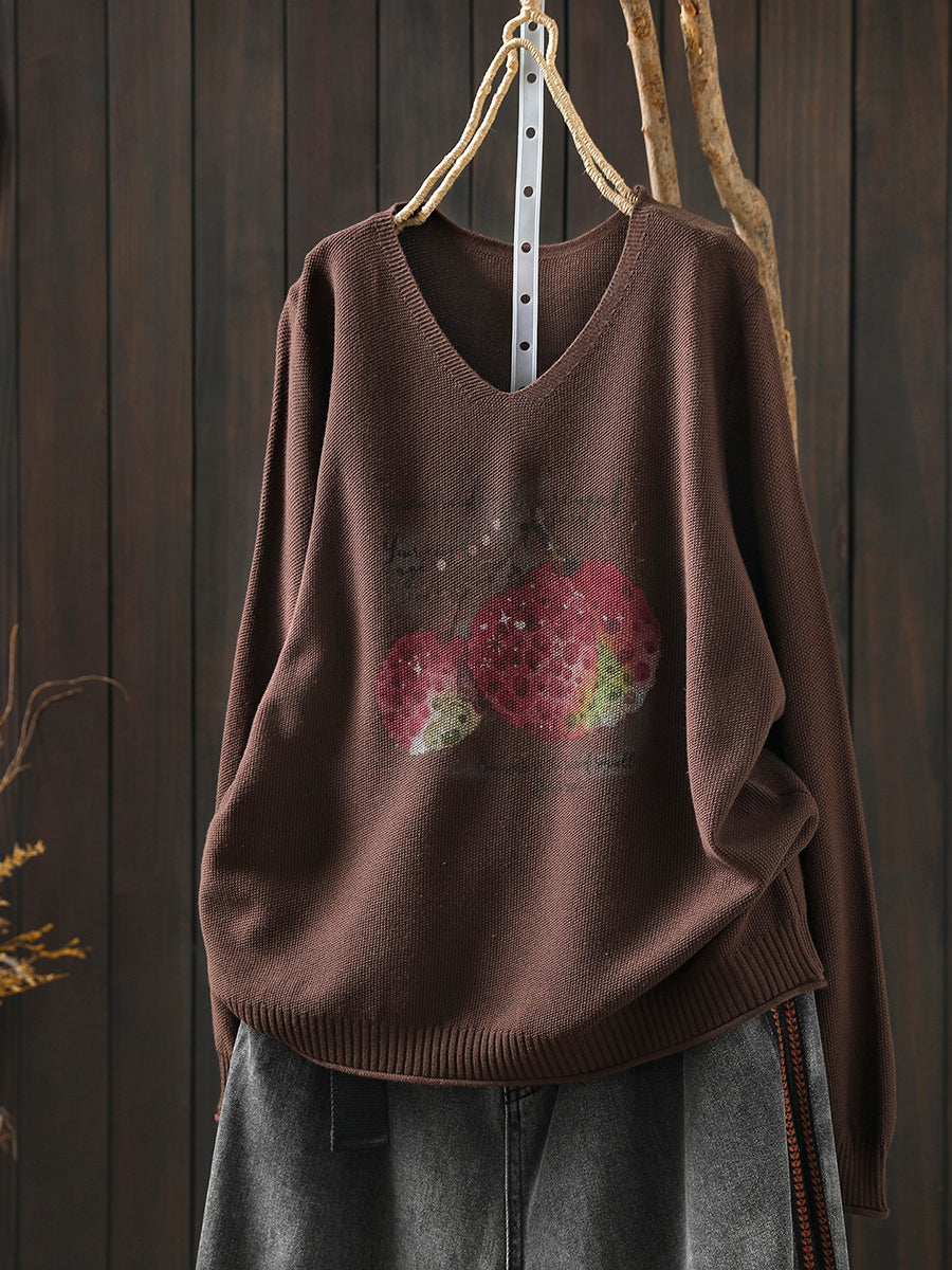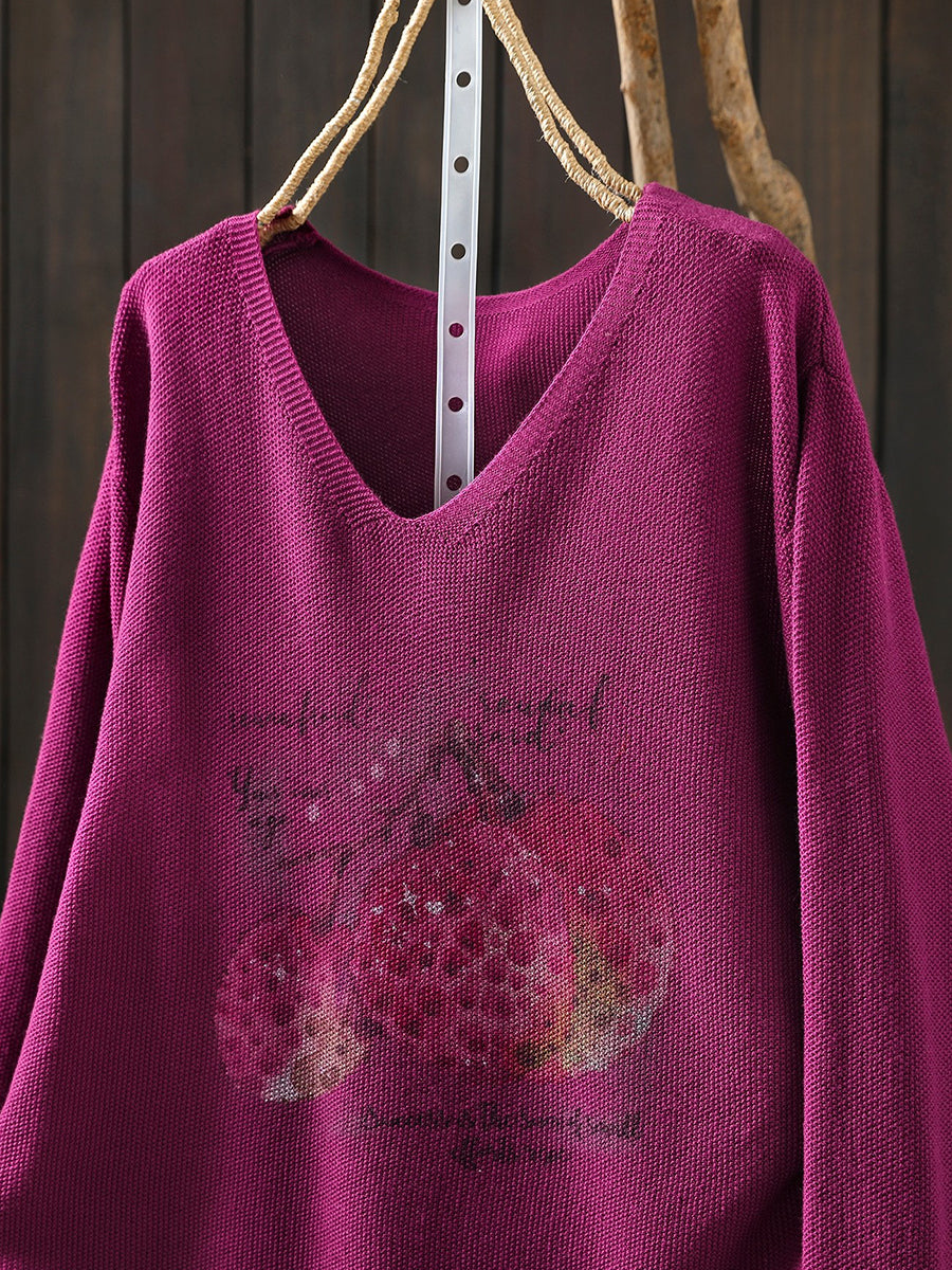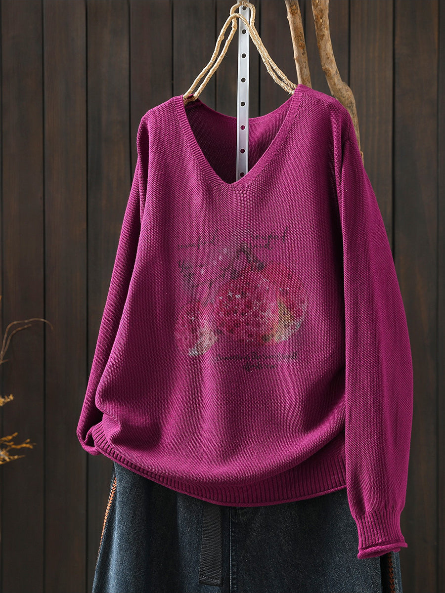 Women Spring Print V-Neck Knitted Blouse