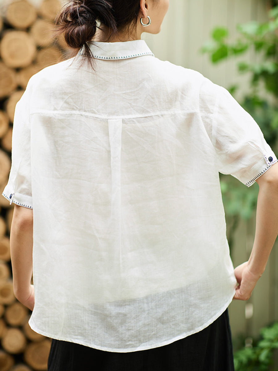 Plus Size Women Summer Artsy Ramie Turn-down Collar Shirt