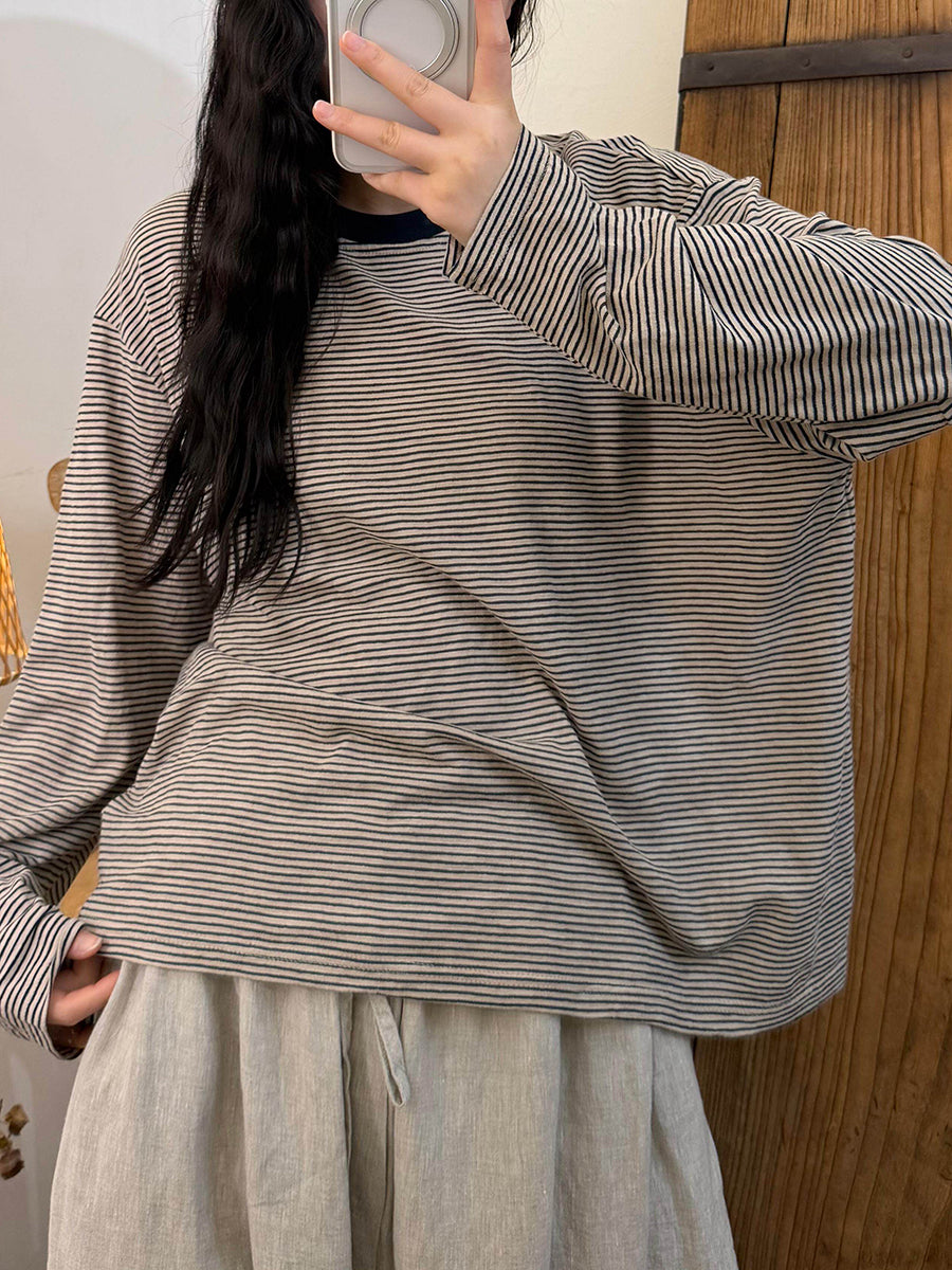 Women Summer Casual Stripe O-Neck Cotton Blouse