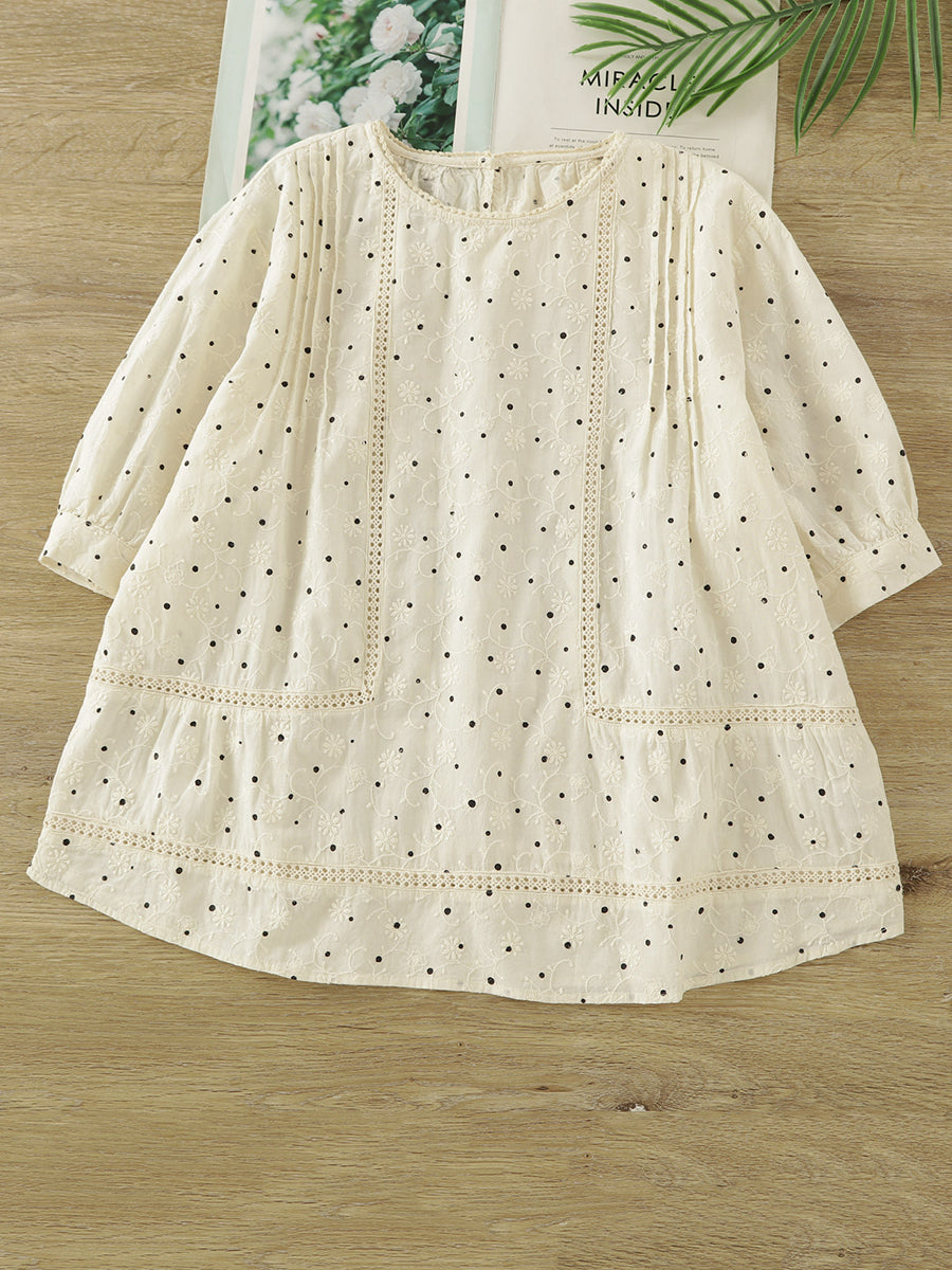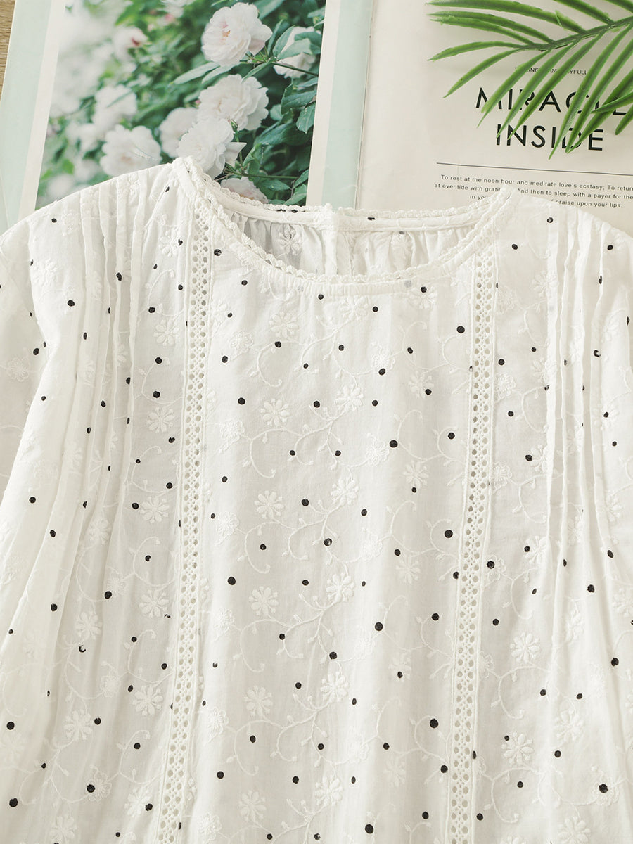 Women Summer Embroidery Dot O-Neck 100%Cotton Blouse
