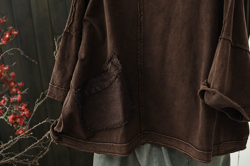 Plus Size Women Autumn Retro Pure Color Cotton Spliced O-Neck Shirt