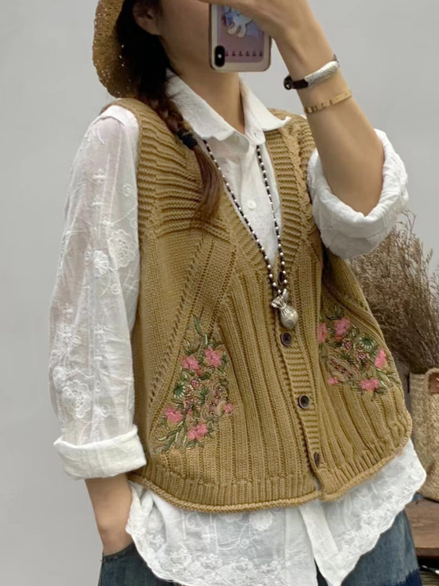 Women Vintage Floral Embroidery V-neck Knitted Vest