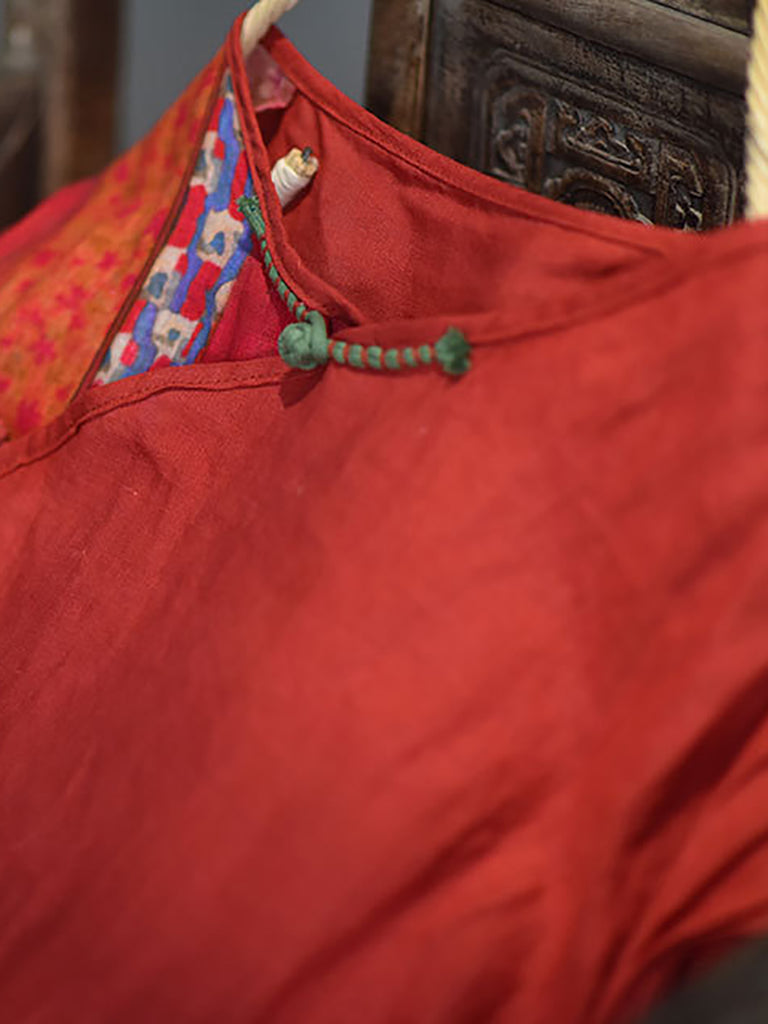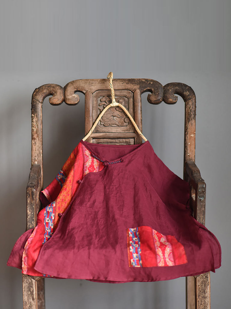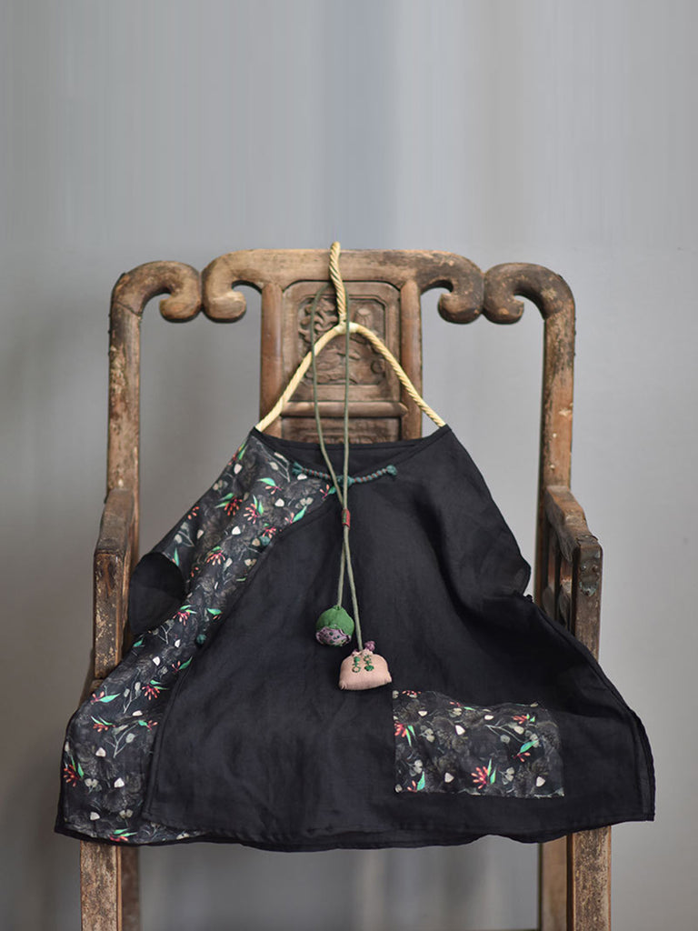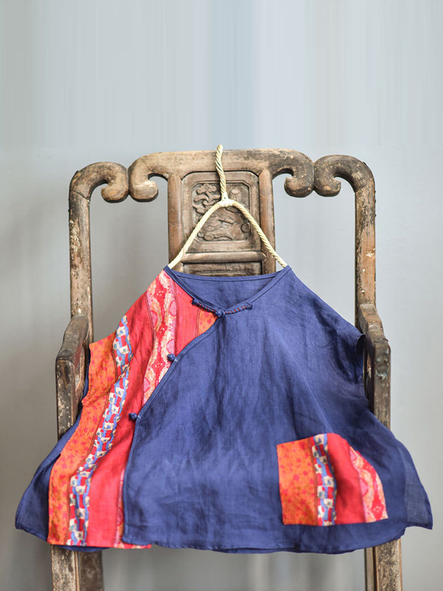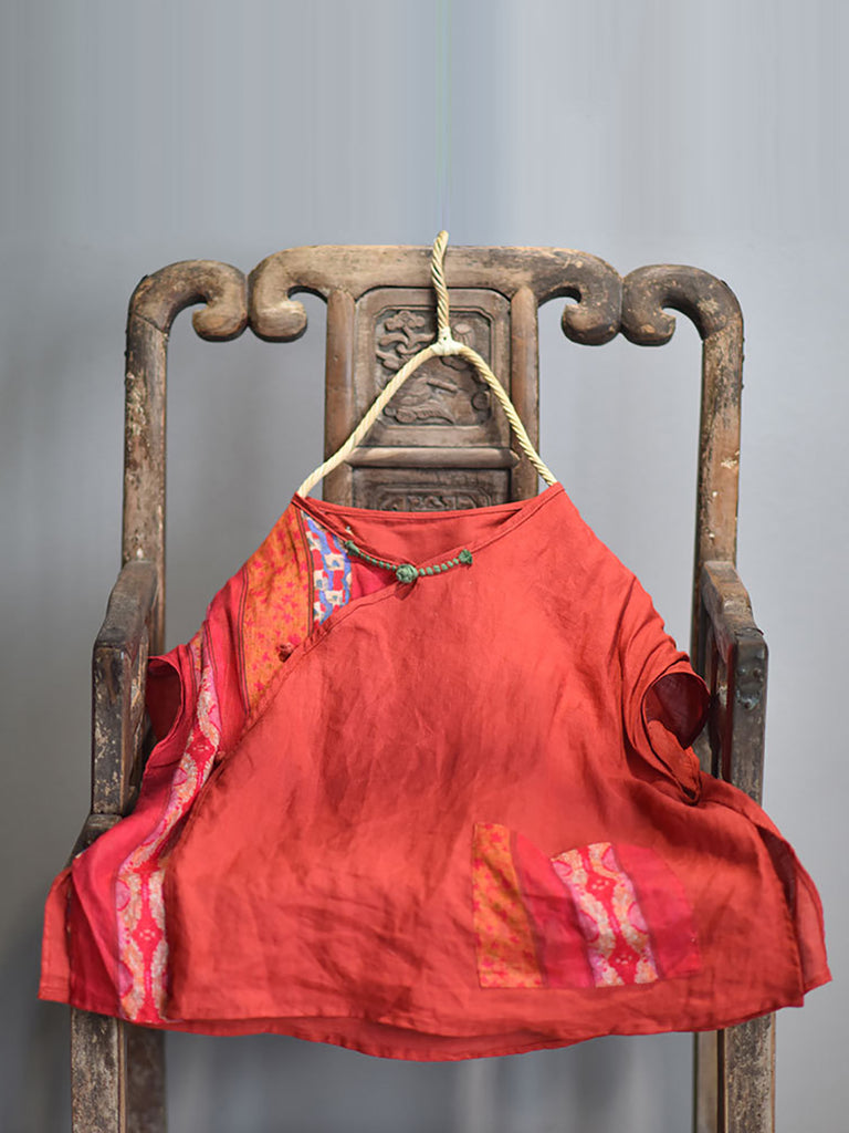Women Vintage Patch Spliced Frog Pocket Summer Loose Shirt