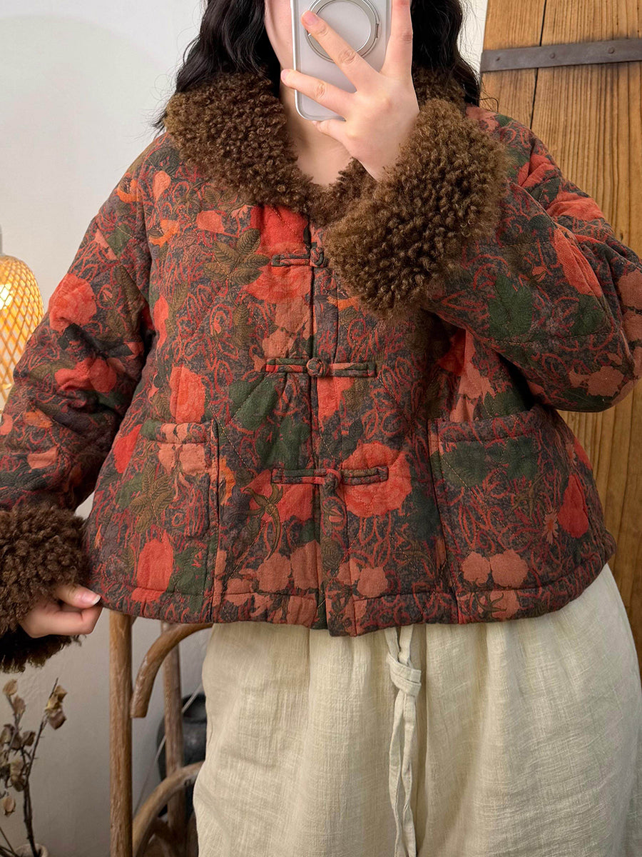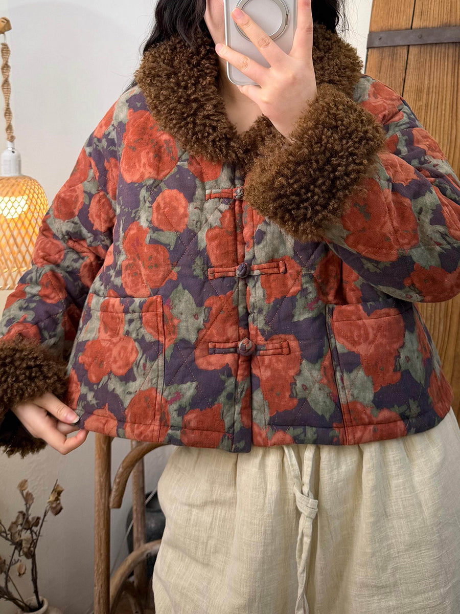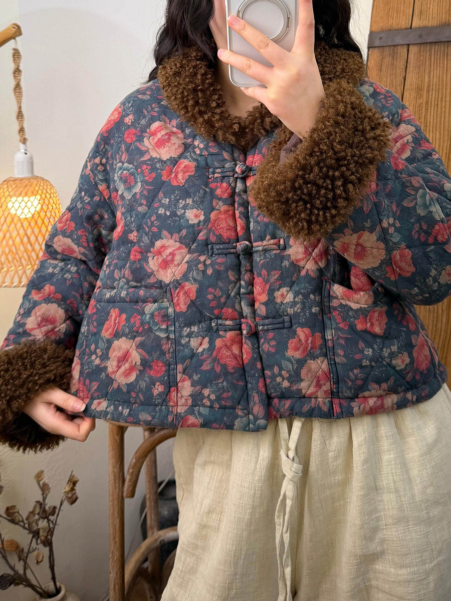 Women Winter Flower Fleece Spliced Padded O-Neck Coat
