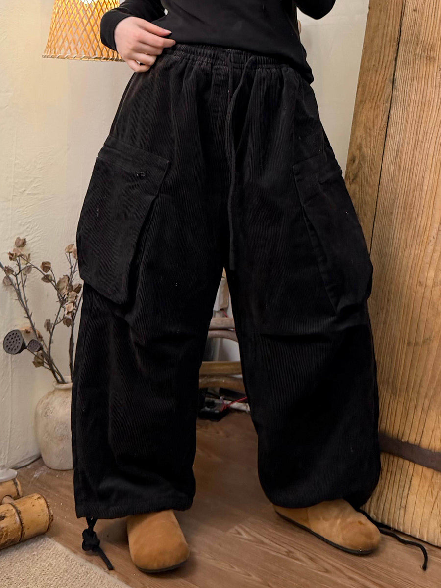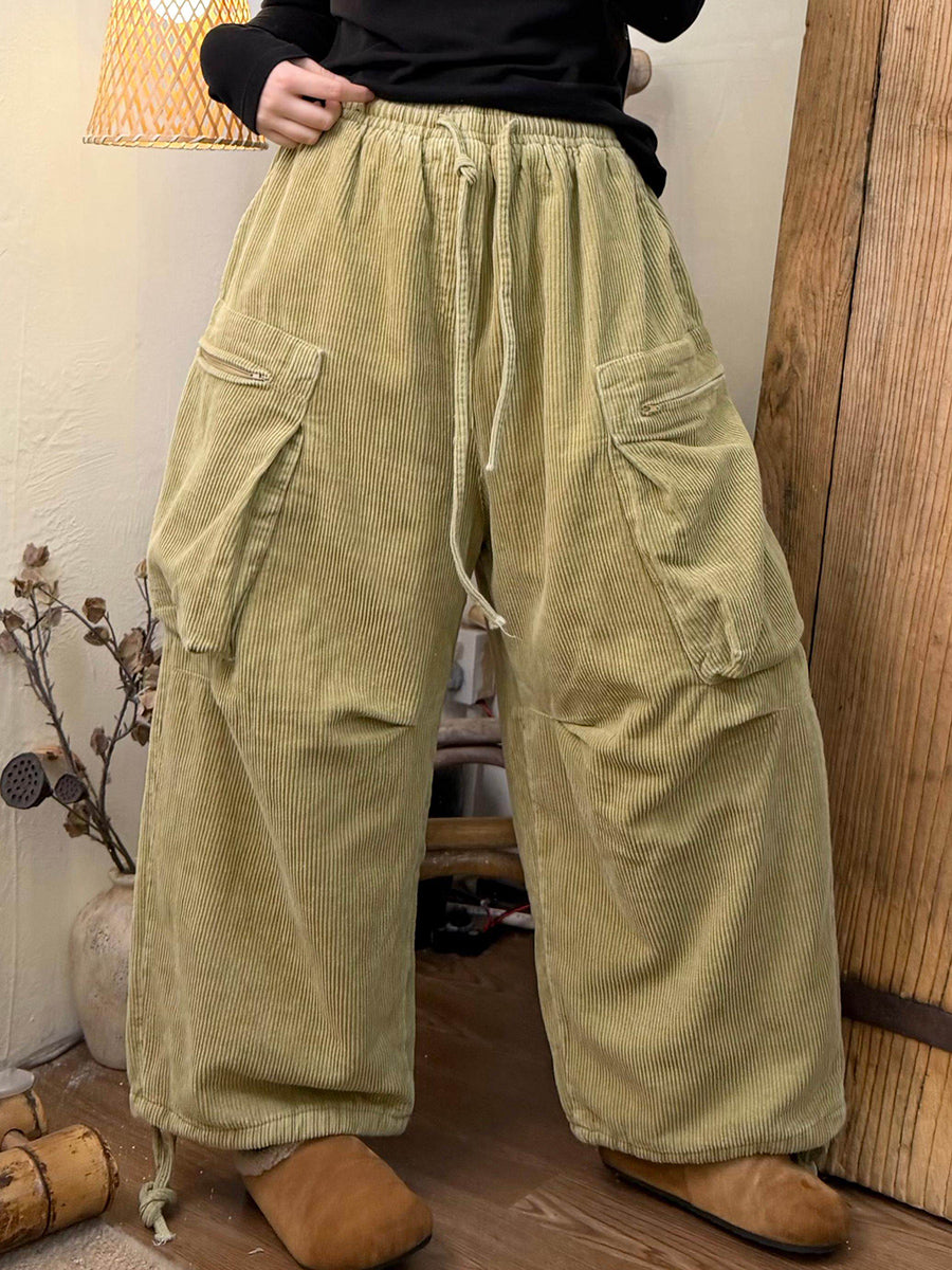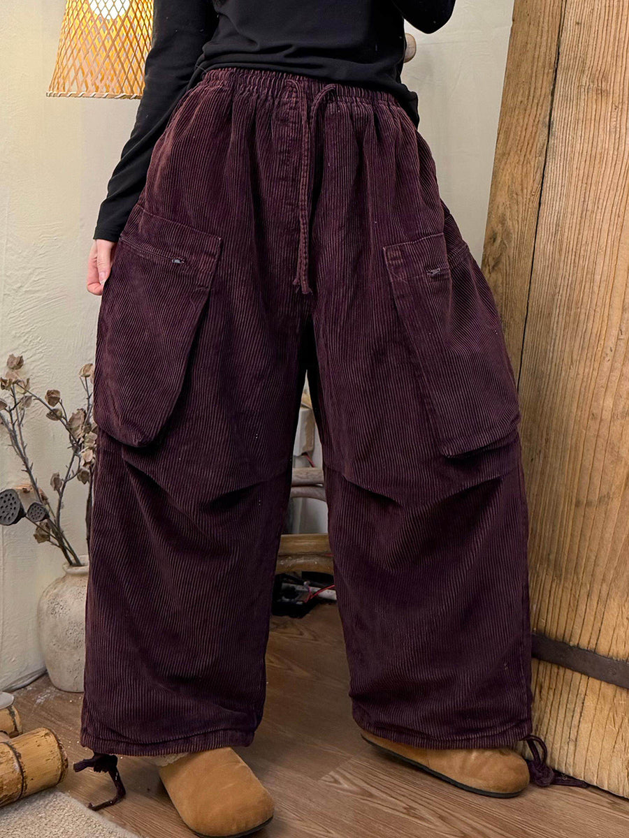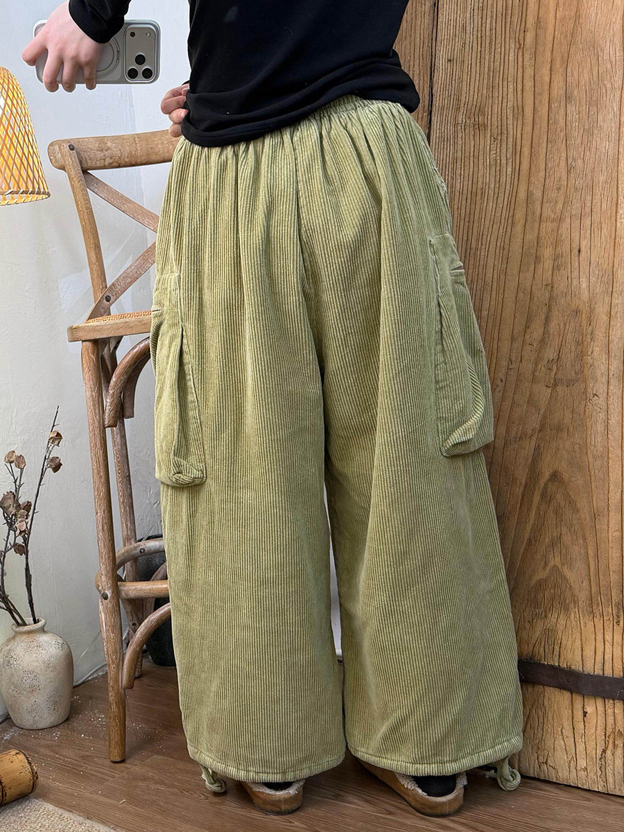 Women Winter Retro Pure Color Corduroy Wide-leg Pants