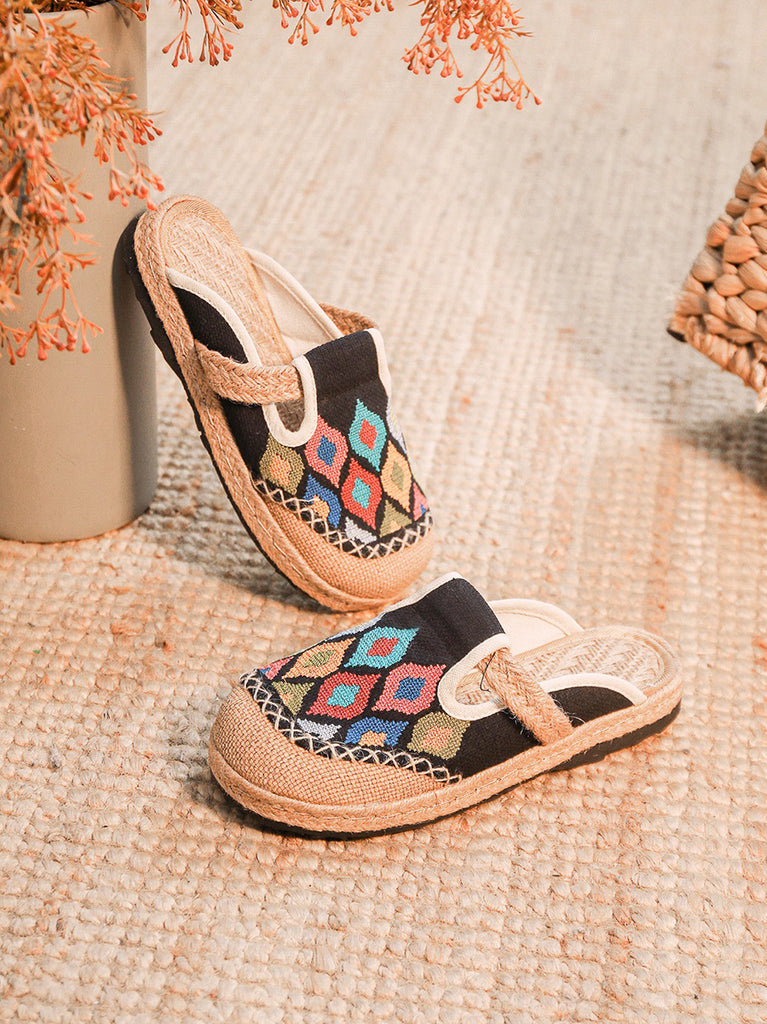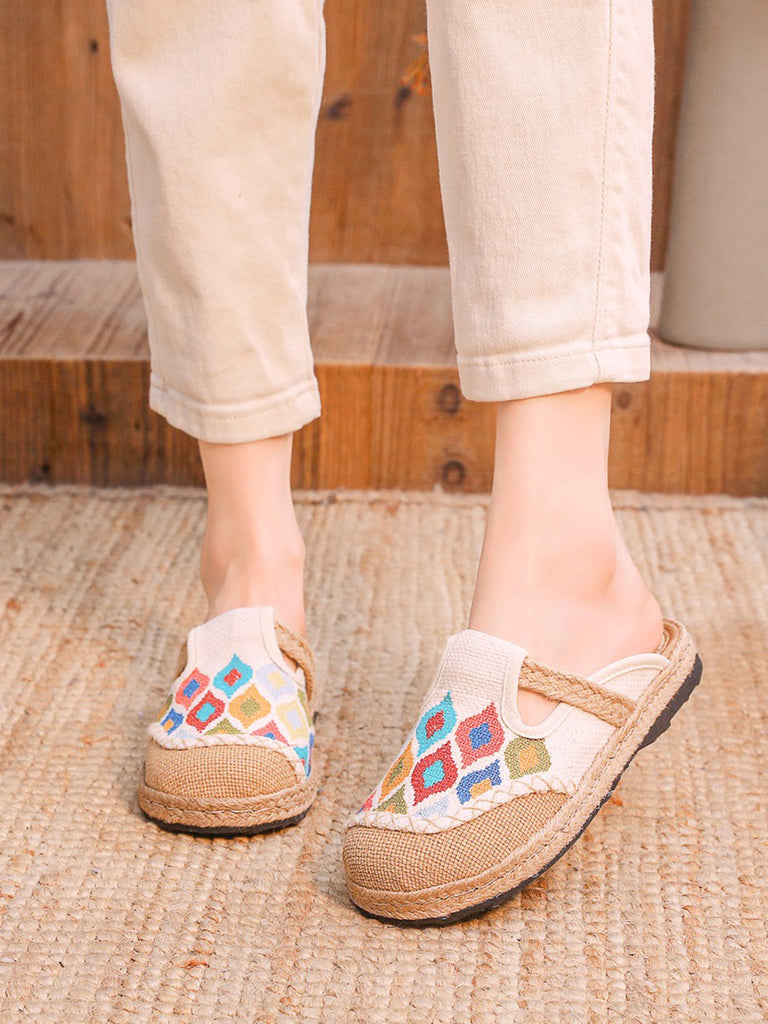 Pantufas femininas rasteiras de algodão e linho com blocos de cores étnicas
