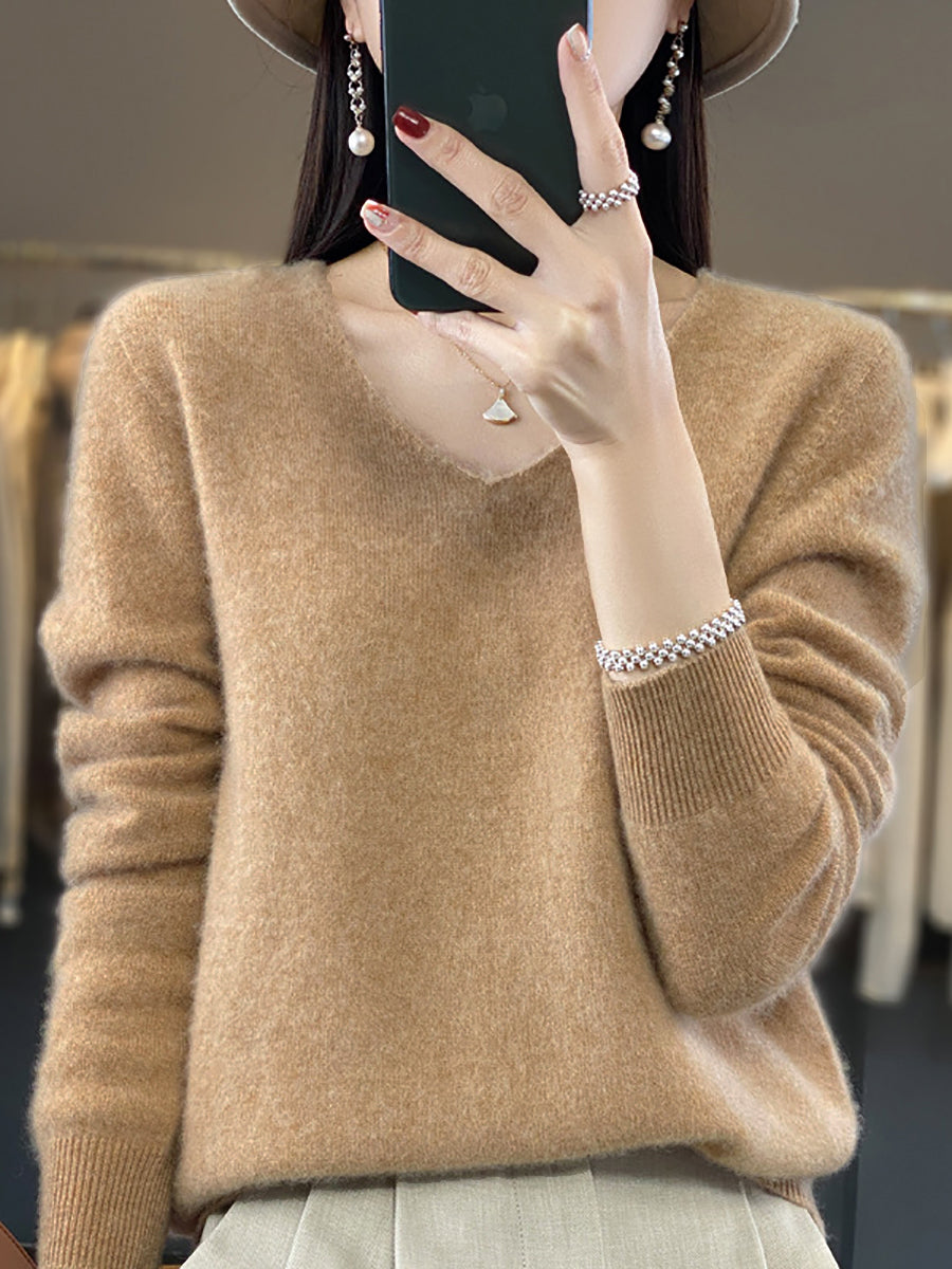 Suéter de malha com decote em V de cor pura para mulheres outono