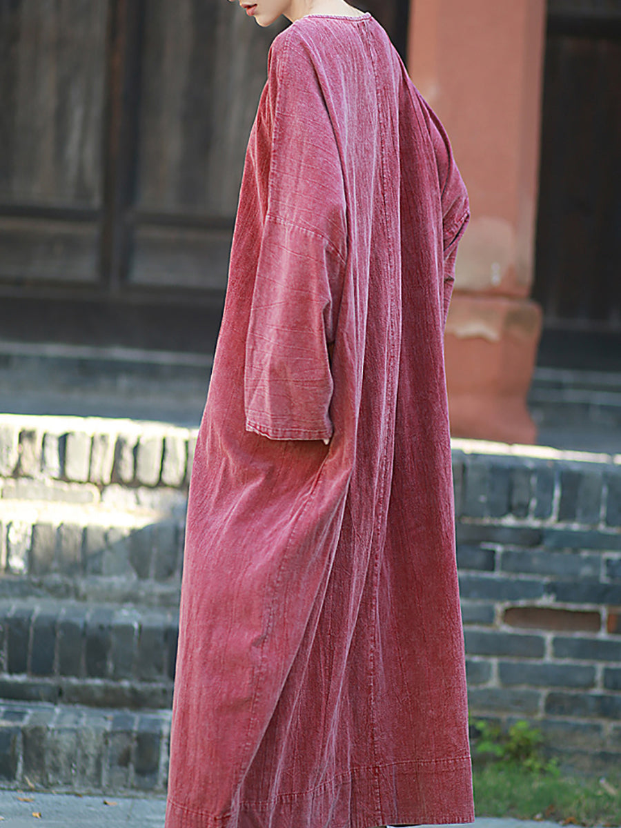 Vestido feminino de algodão e linho, retrô, cor pura, gola redonda, outono