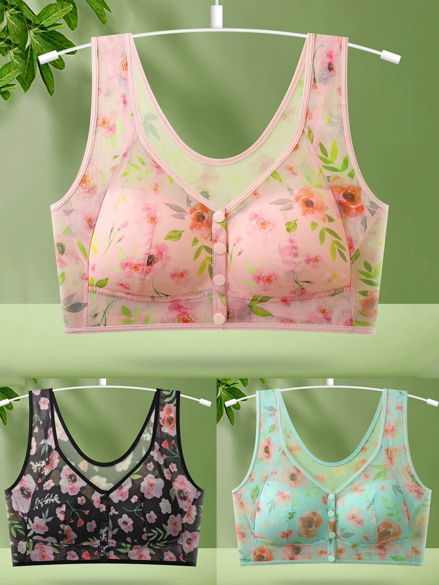 Conjunto de 3 peças de sutiã sem aro com fecho frontal e estampa floral artística.
