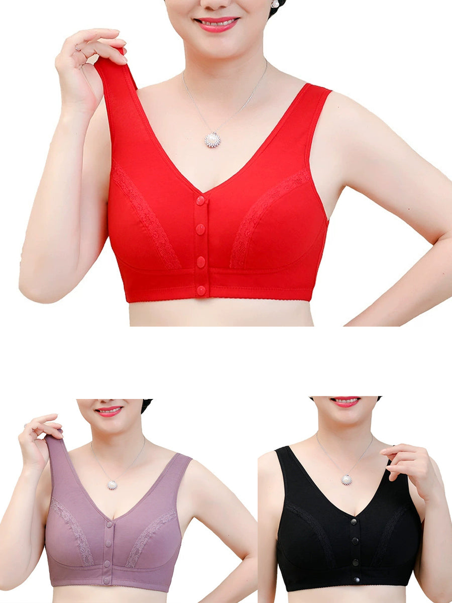 Conjunto de 3 peças de sutiã sem aro com fecho frontal em cor lisa e estilo artístico.