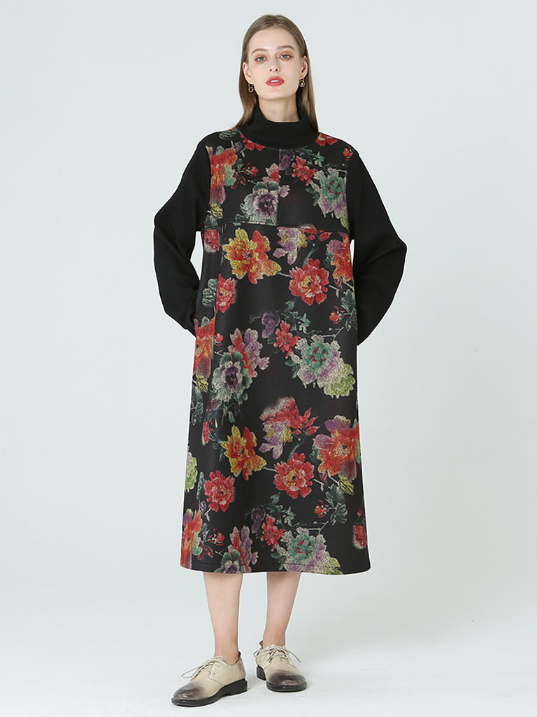 Plus size estampas florais gola alta manga comprida vestido primavera inverno M-2XL