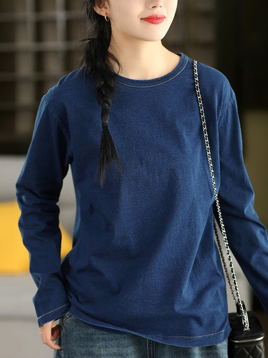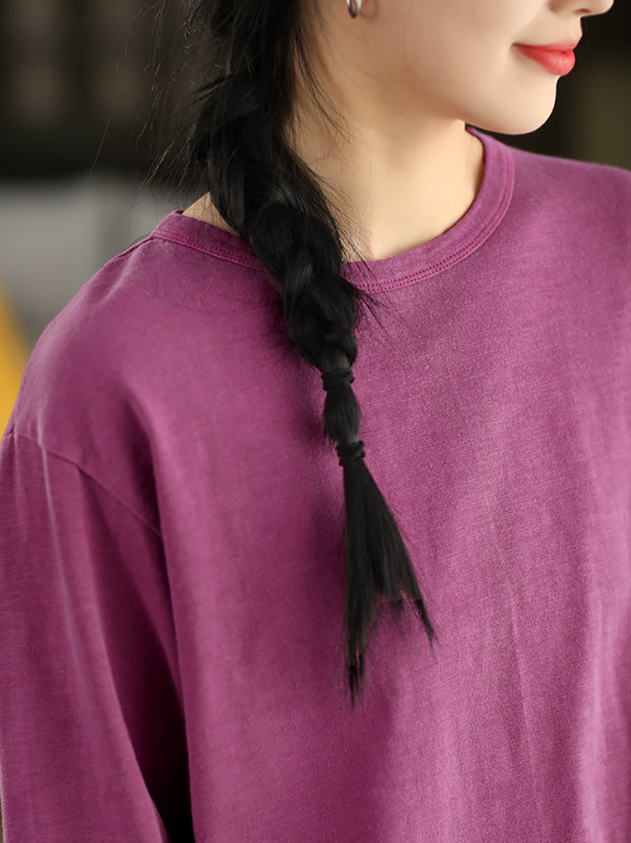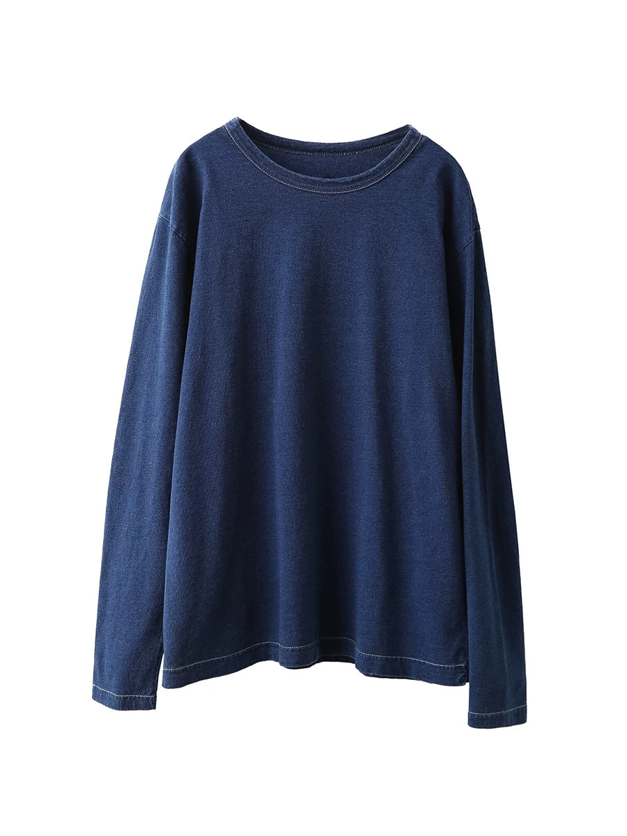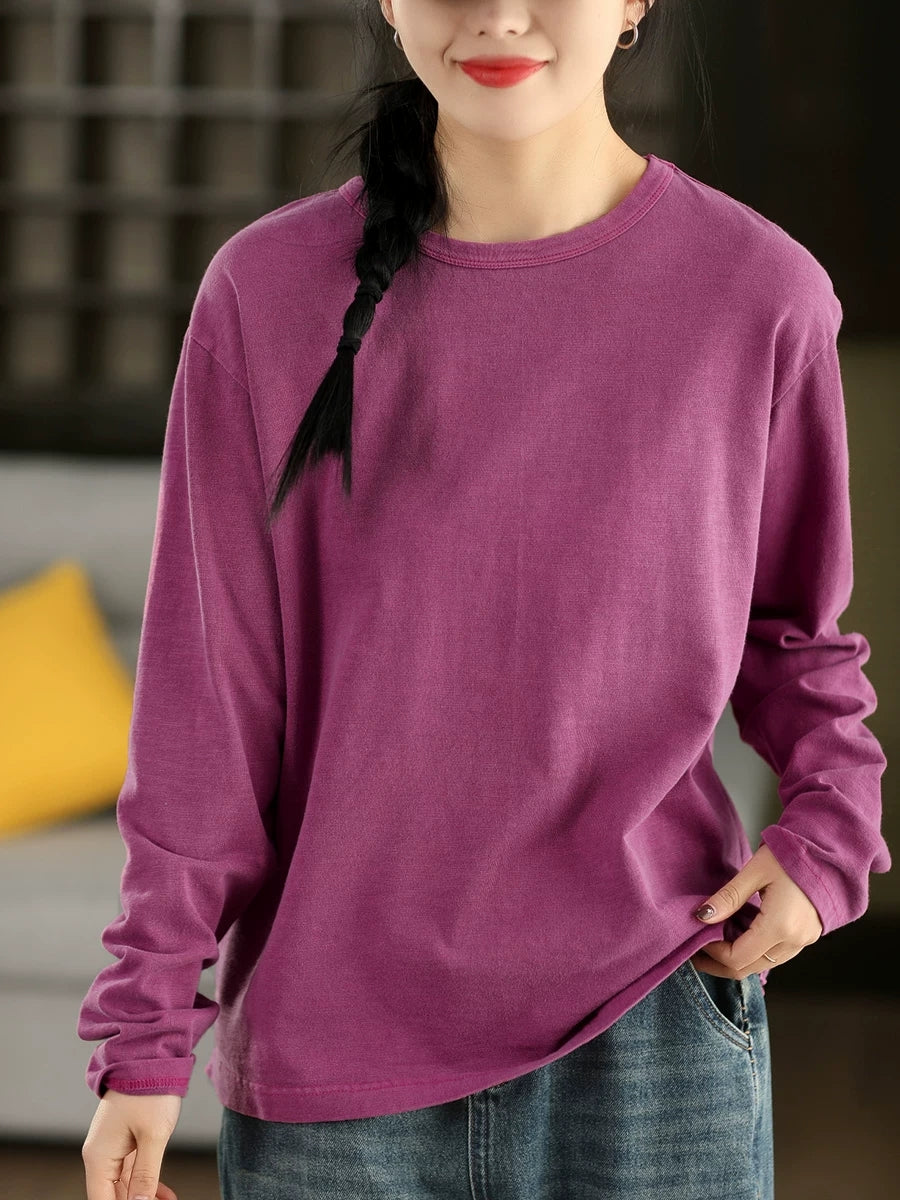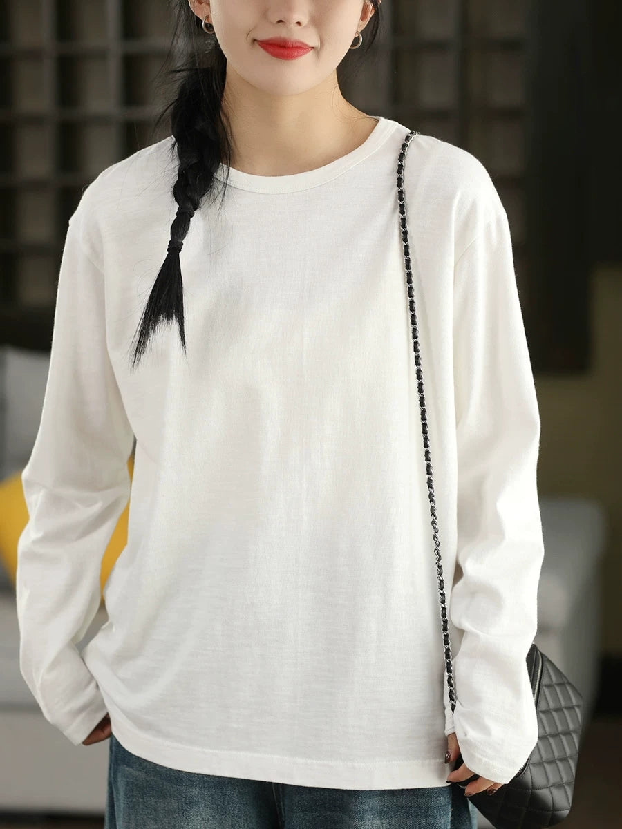 Blusa feminina de algodão 100% com decote redondo, estilo artístico e cor lisa para a primavera.