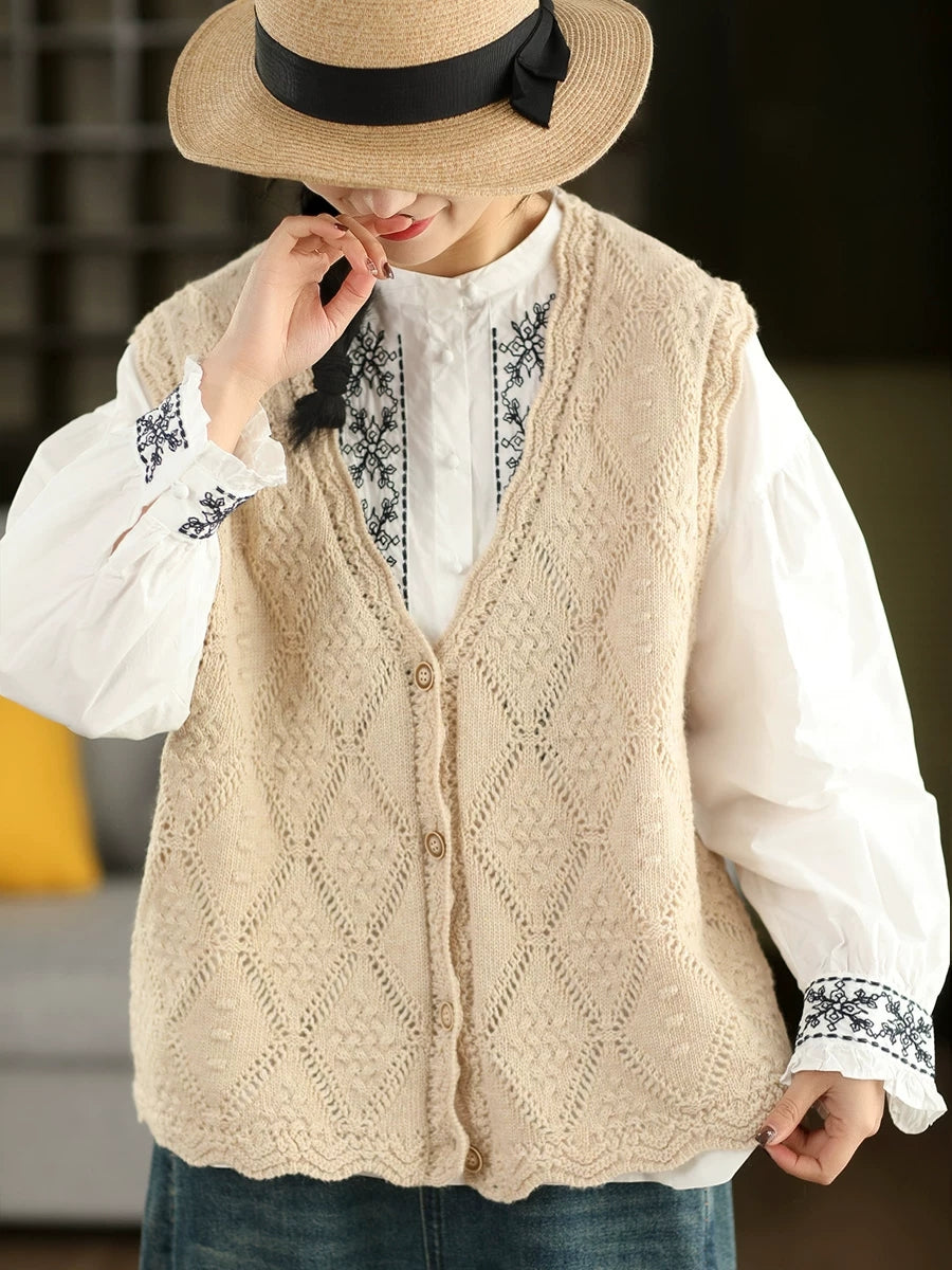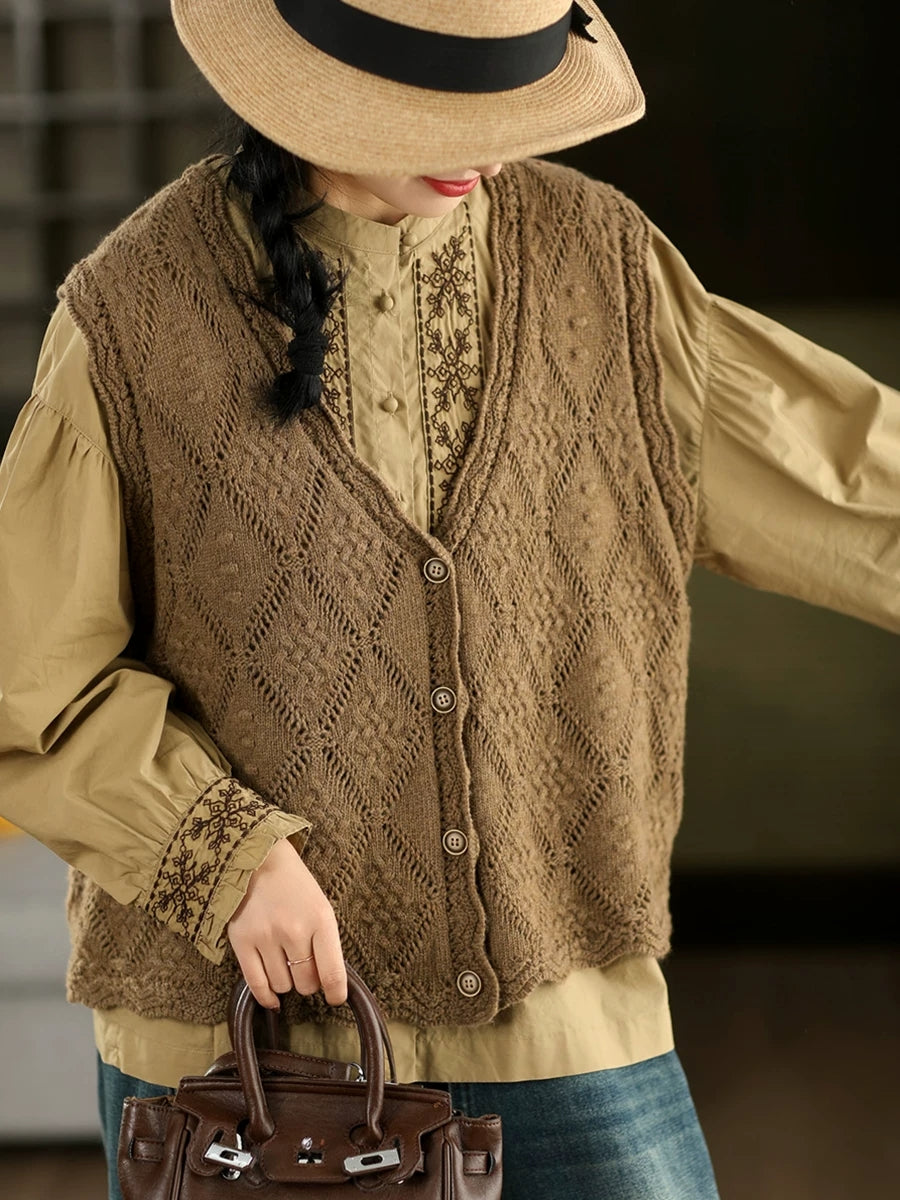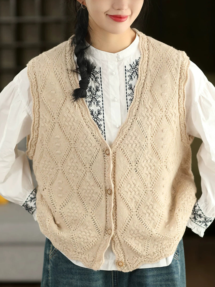 Colete feminino de tricô com decote em V e estampa de losangos, estilo artístico, para a primavera.