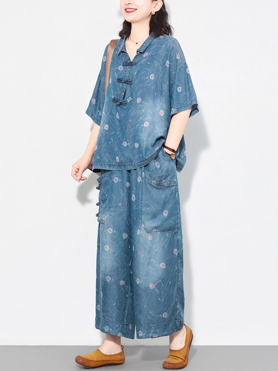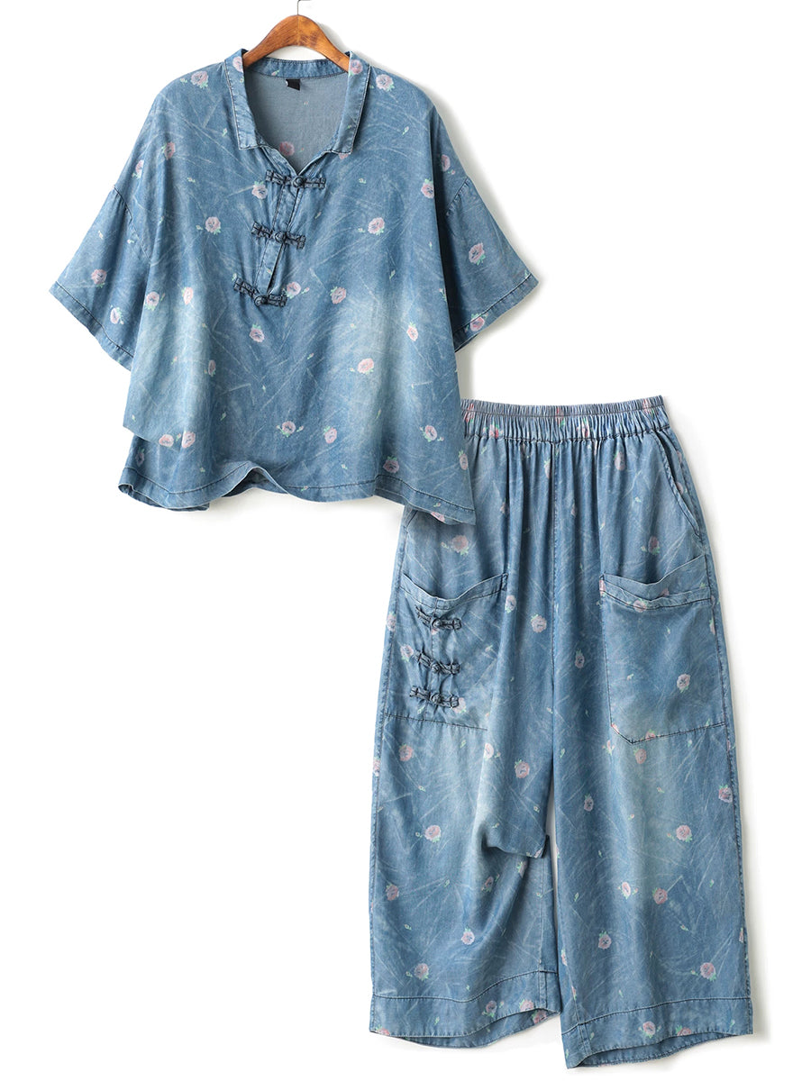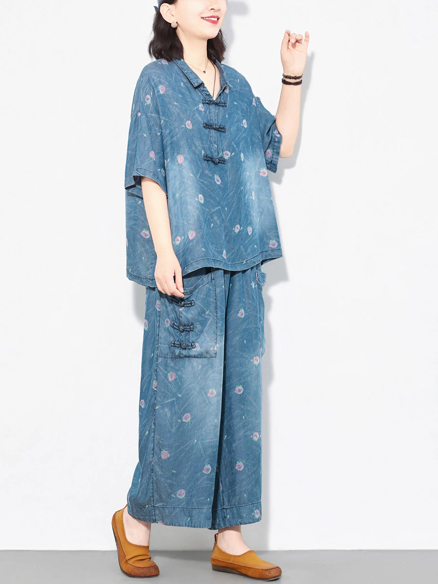 Conjunto feminino de verão em jeans com estampa floral étnica