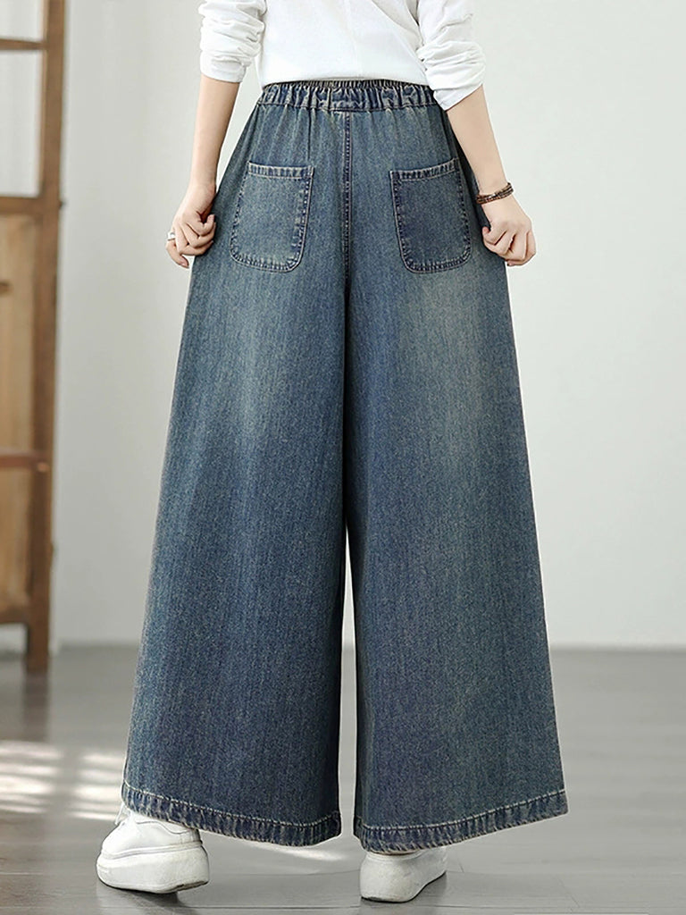 Pantaloni largi din denim cu broderie artistică pentru femei de toamnă