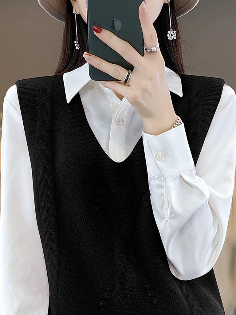 Confecționată din acril, această vestă fără mâneci are un design în culori solide și un guler în V. Stilul său artistic o face ideală pentru ținutele de primăvară și toamnă.