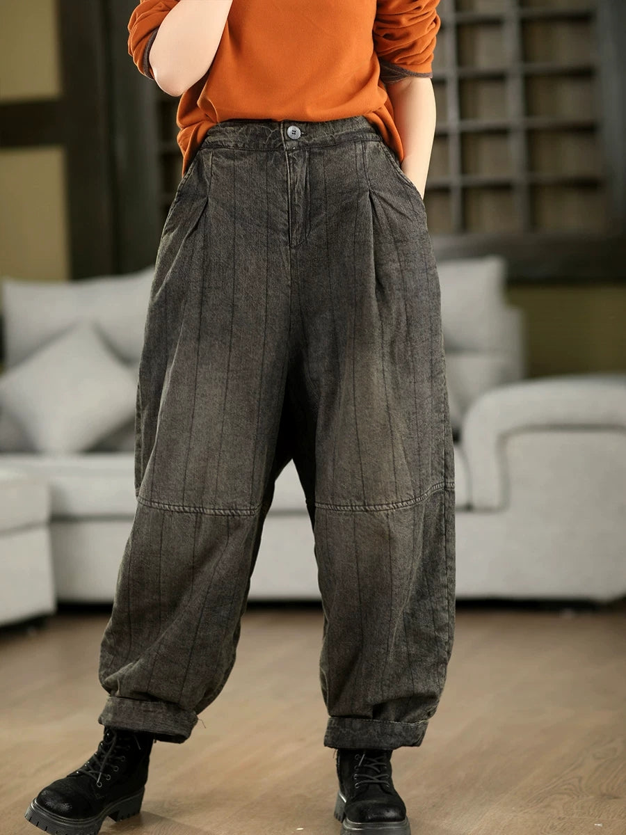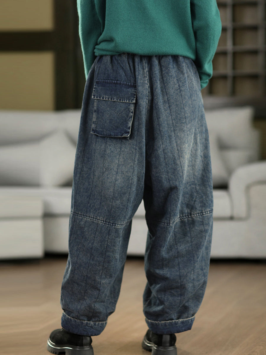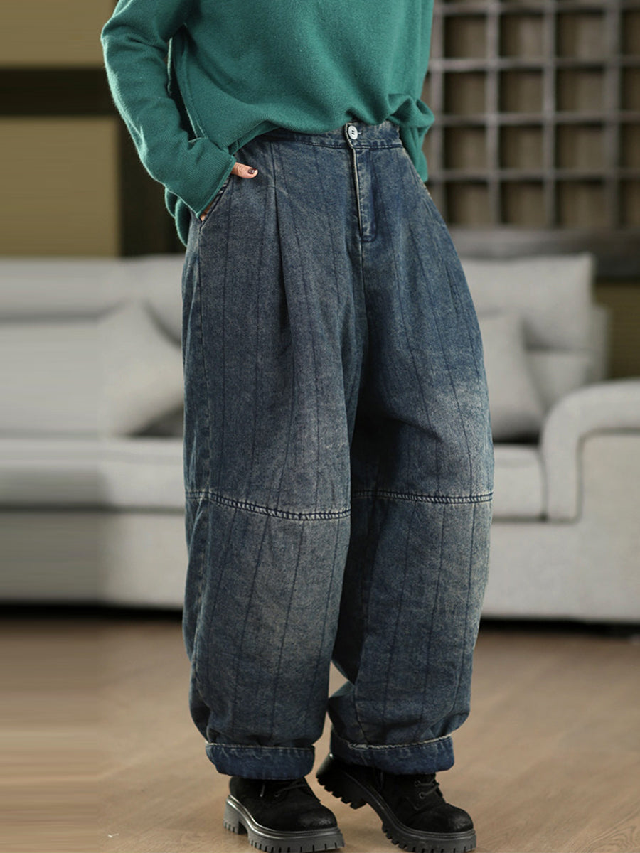 Pantaloni de iarnă retro spălați din denim căptușit pentru femei