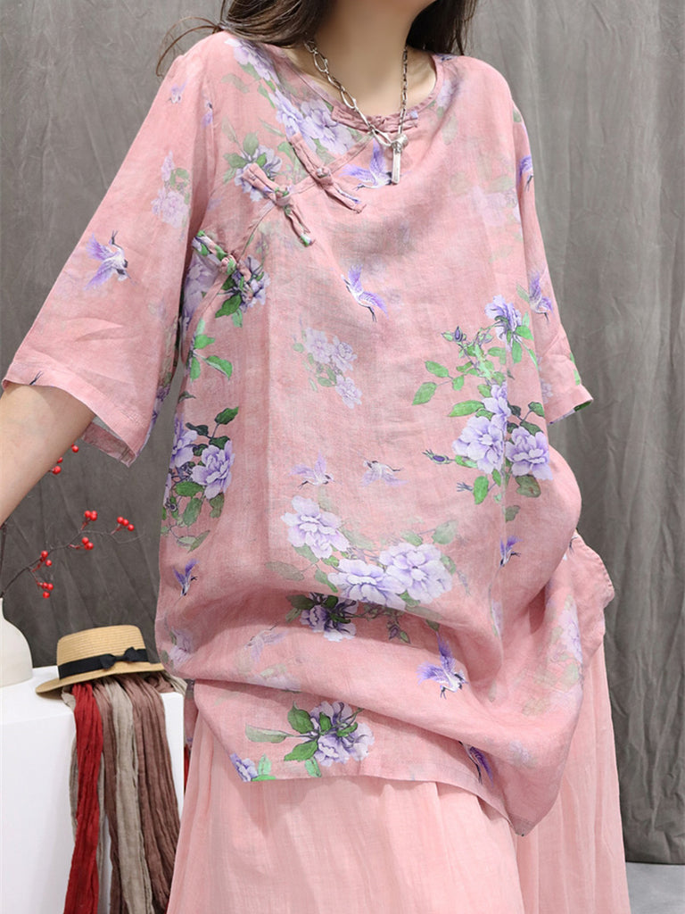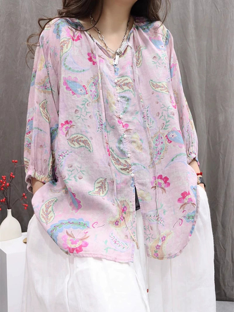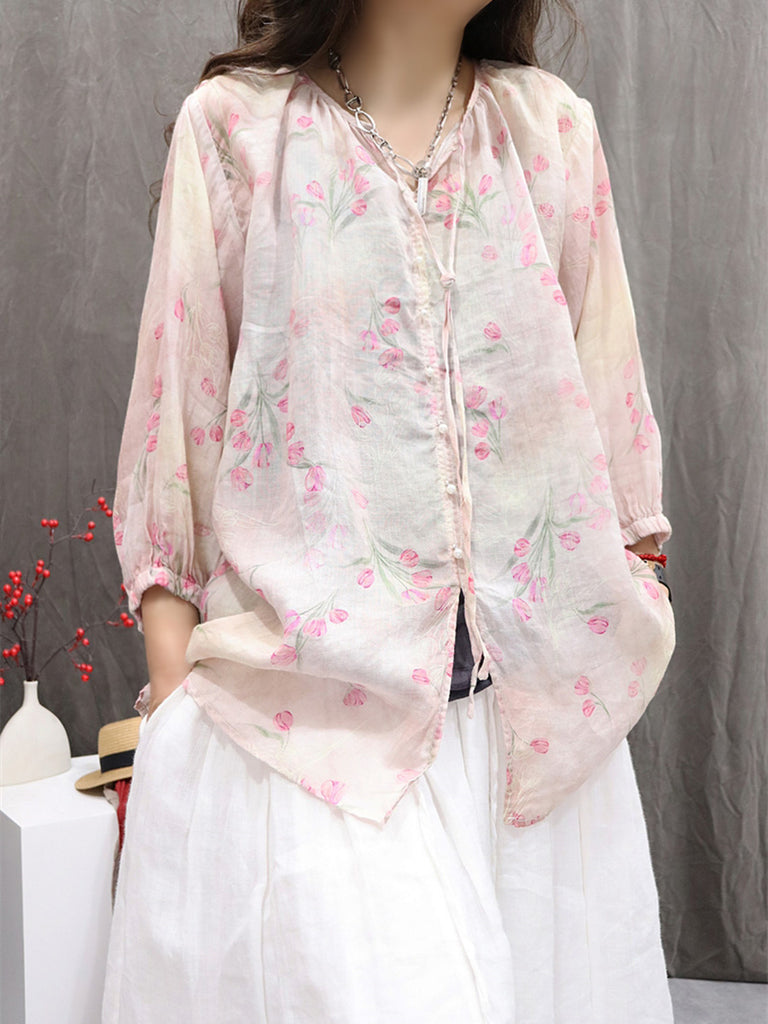 Vinterskjorta med konstnärlig nedfällbar krage och blommig 100 % bomull för kvinnor