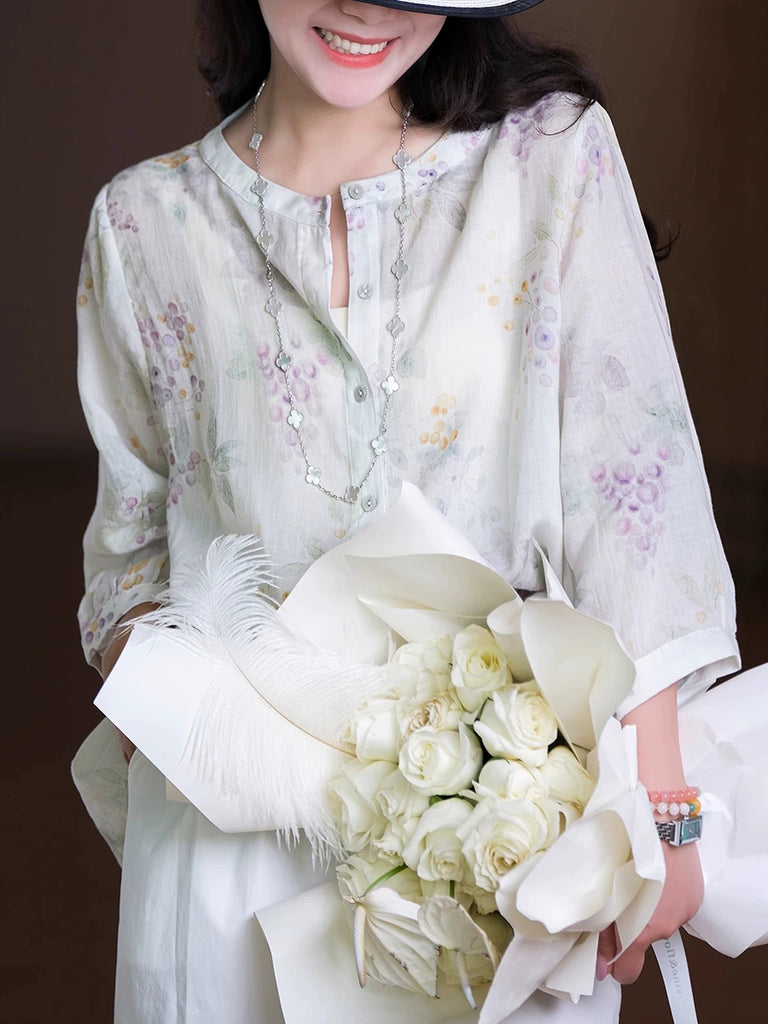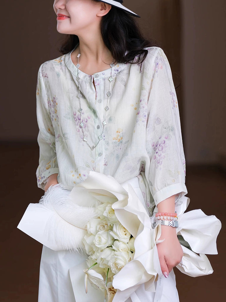 Konstnärlig vårskjorta med blommig O-ringning i bomull för kvinnor