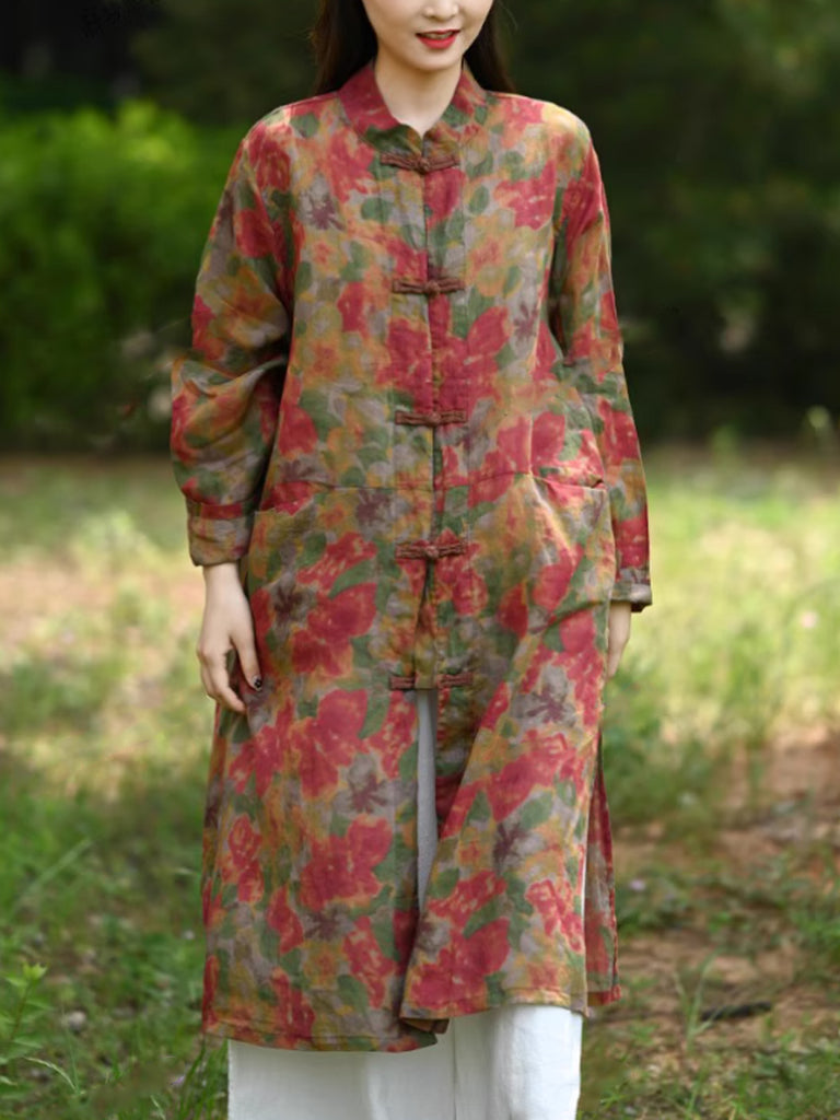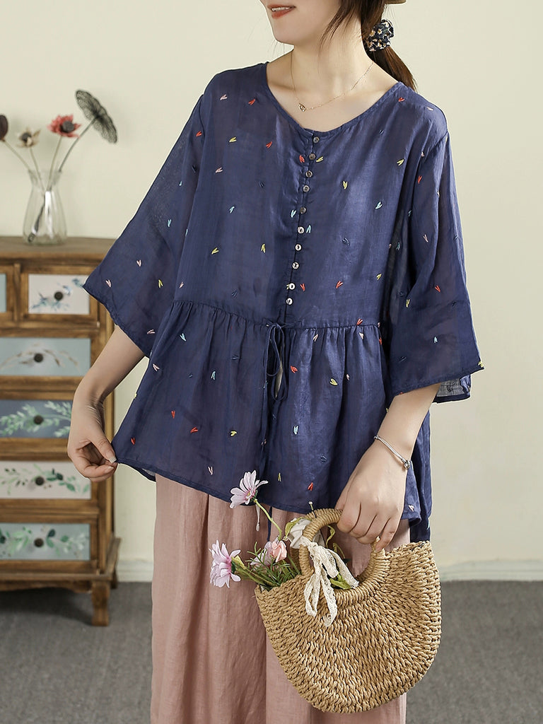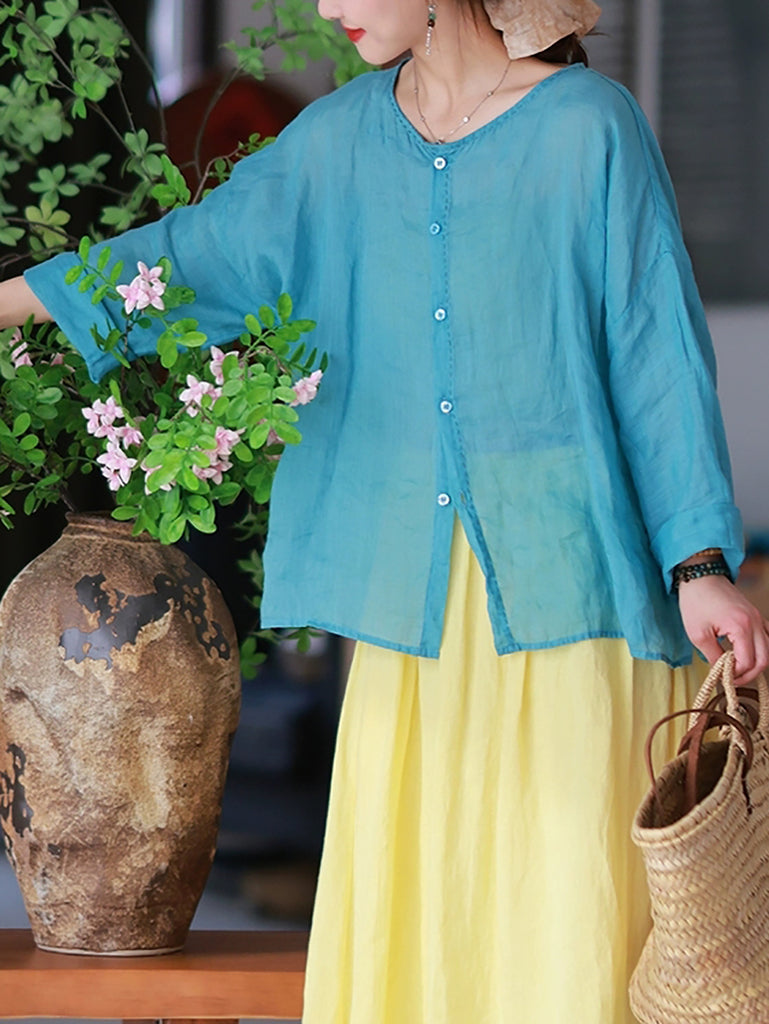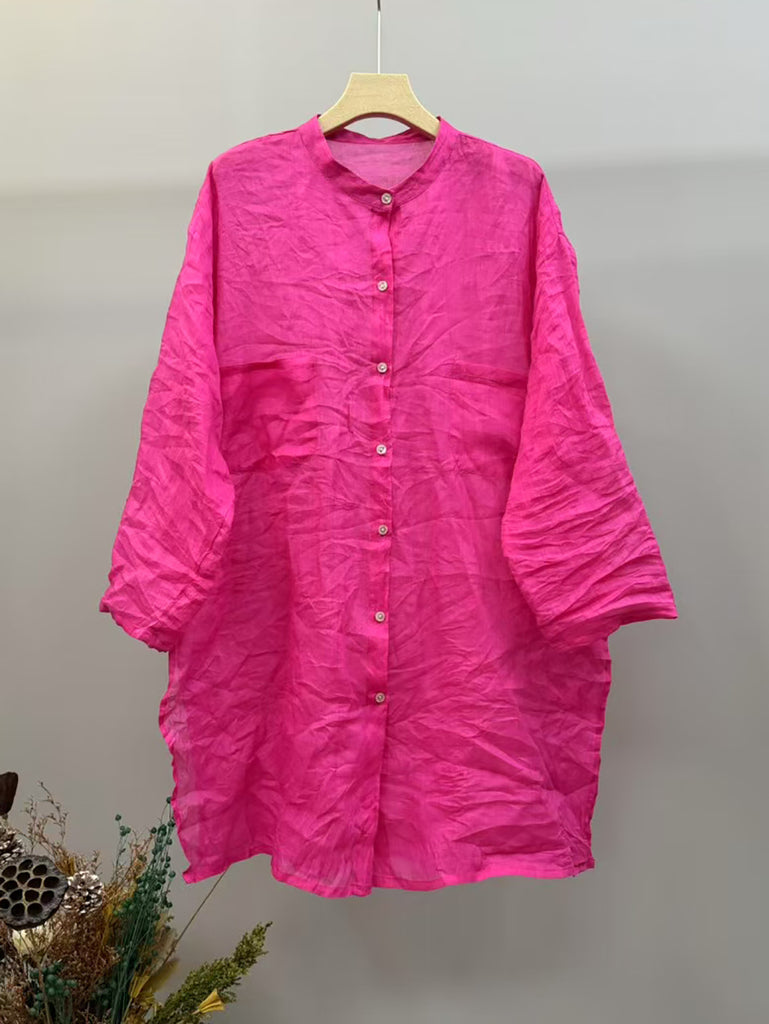 Etnisk vårskjorta för kvinnor i ren färg, 100 % linne