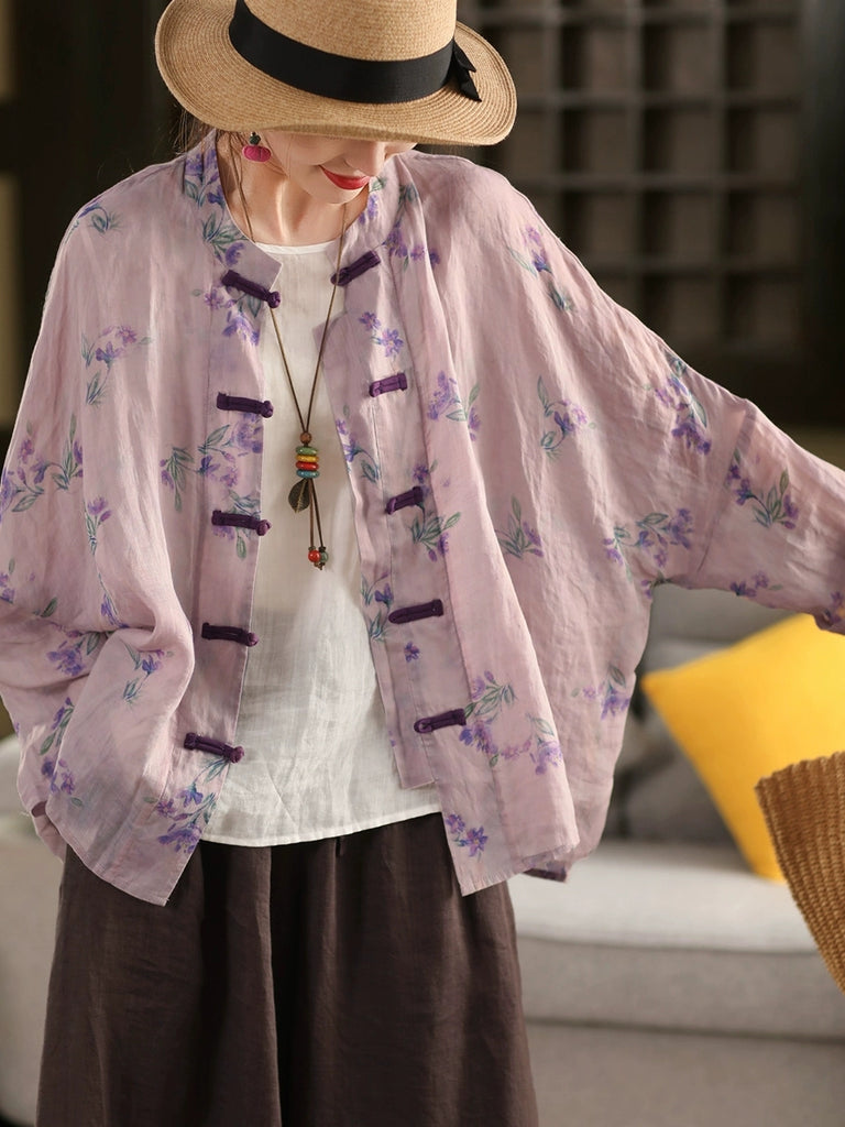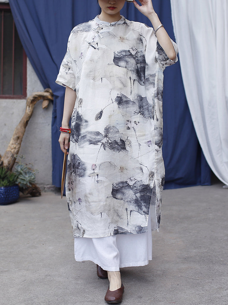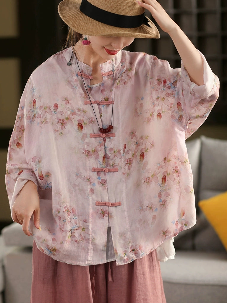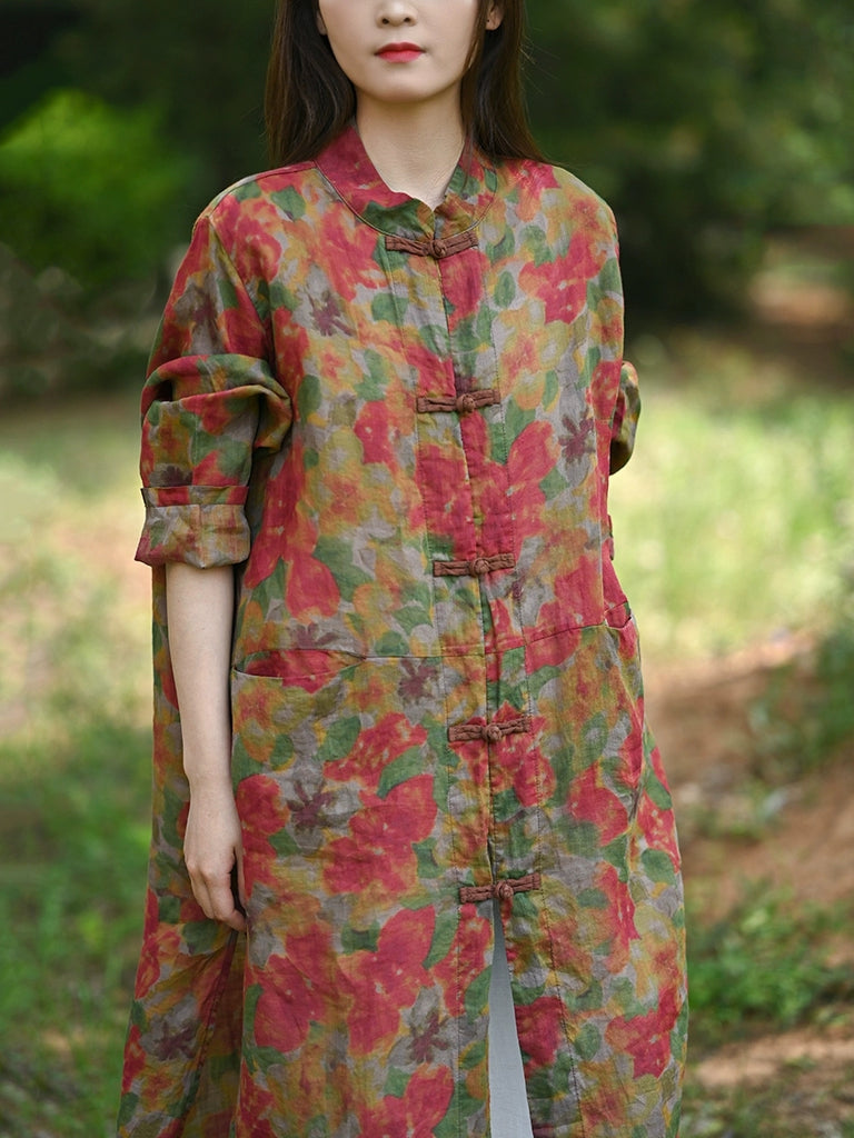 Etnisk vårskjorta för kvinnor i ren färg, 100 % linne