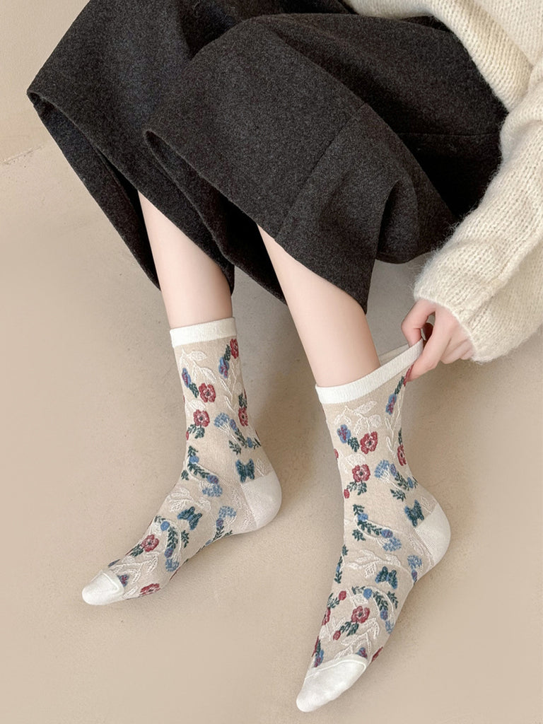5 Pairs Women Artsy Floral Jacquard Cotton Socks