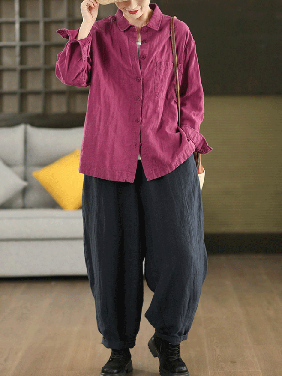 Damskjorta i ren färg, 100 % linne med nedfällbar krage