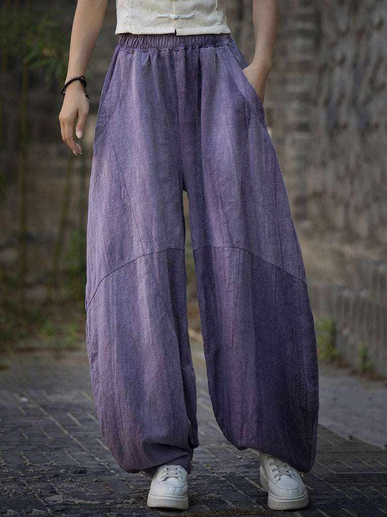 Denna produkt är gjord av 100 % ramie, med en retro och konstnärlig stil. Den elastiska midjan och tie-dye mönstret på dessa bloomers ger en bekväm passform och unik look. Med en ankellång design är dessa byxor perfekta för vår- och sommarsäsongen.