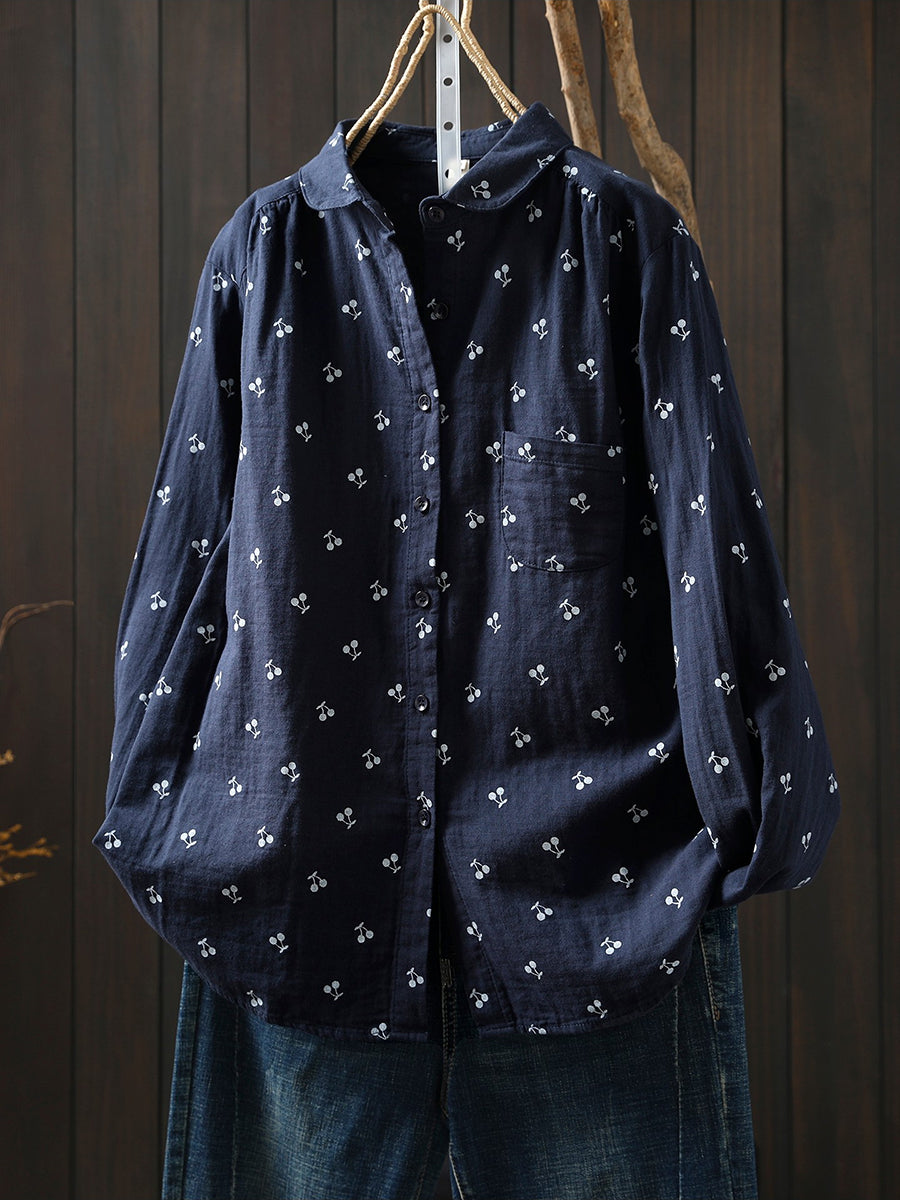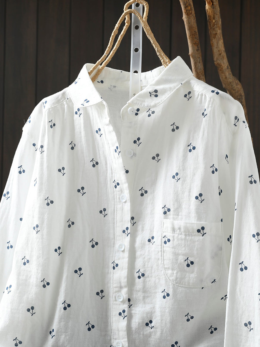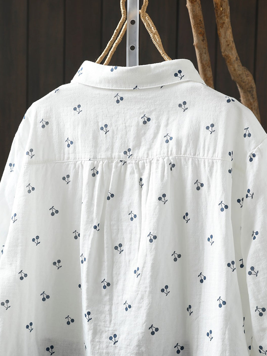 Vårskjorta med konstnärlig körsbärsbroderi för kvinnor i 100 % bomull