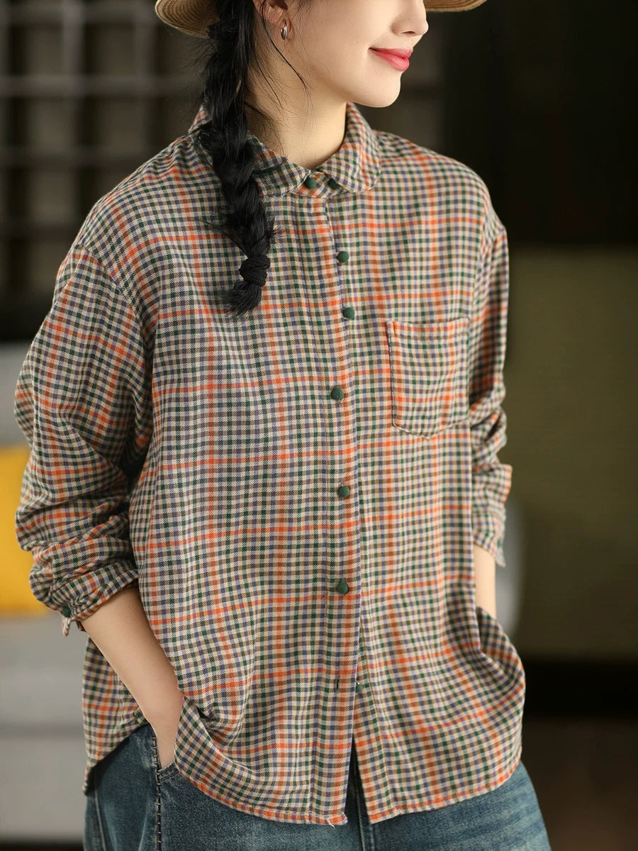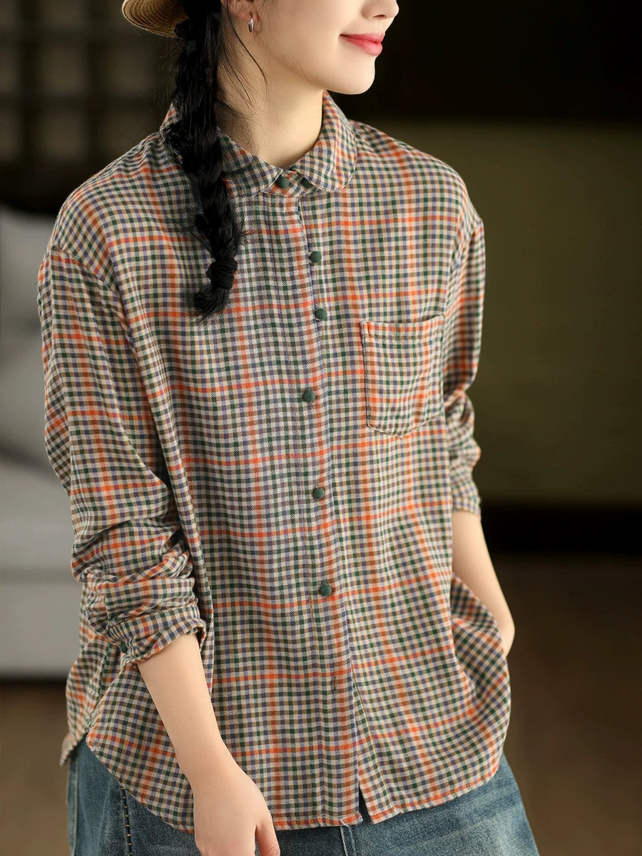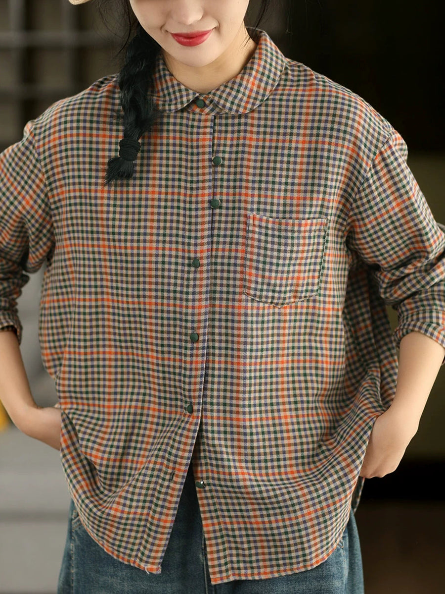 Vårskjorta med konstnärlig rutig krage för kvinnor i 100 % bomull