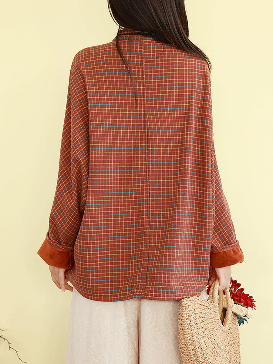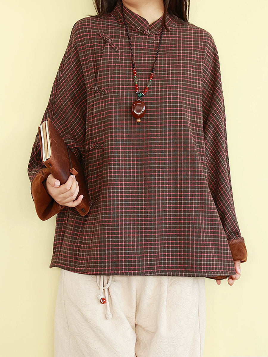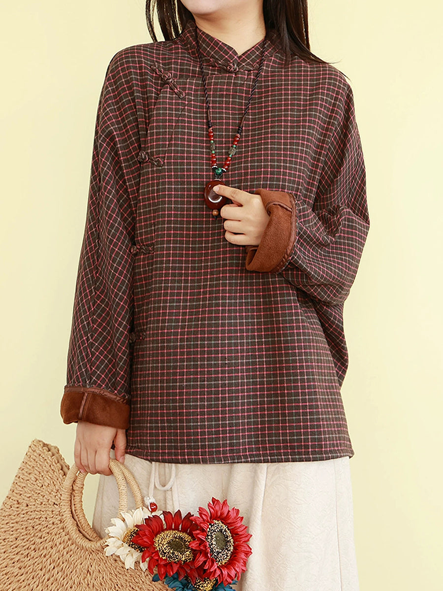 Kvinnors vinterblus med etnisk rutig stående krage och fleecefodrad