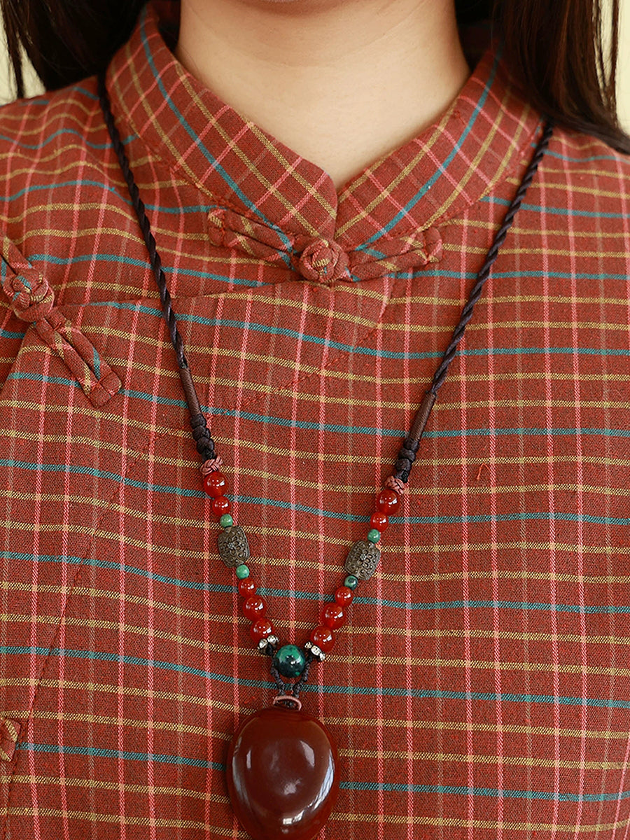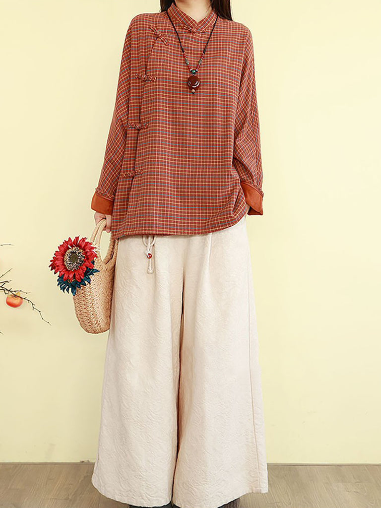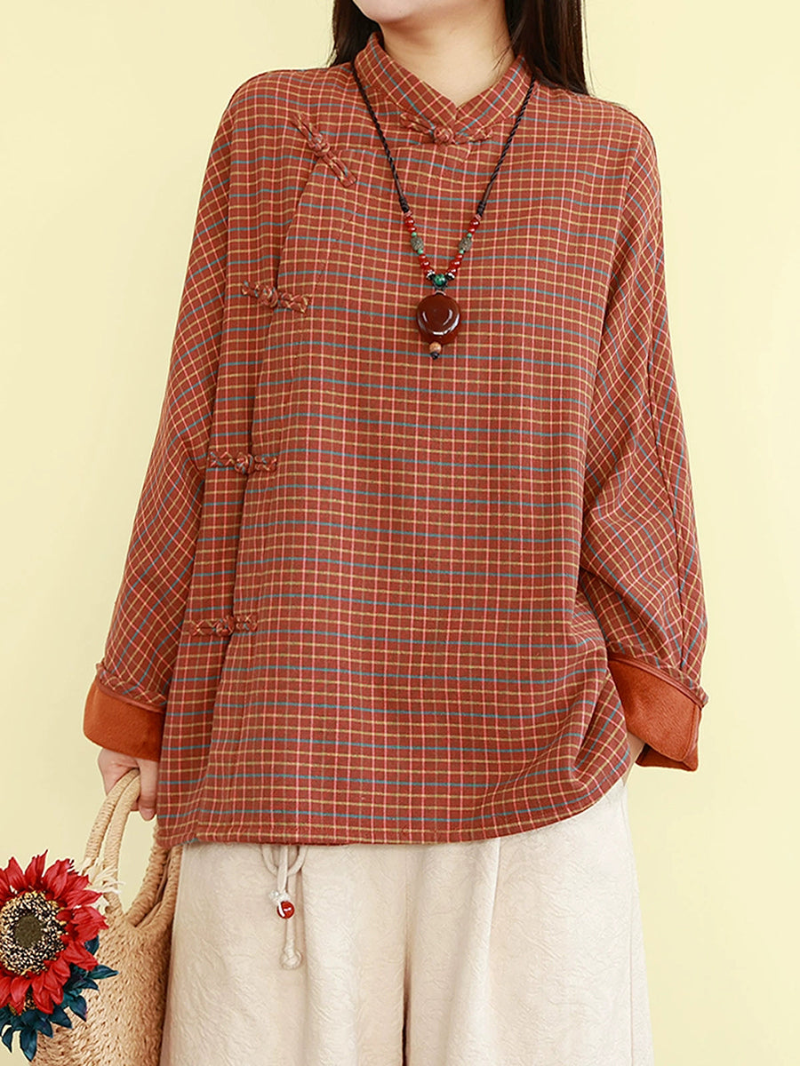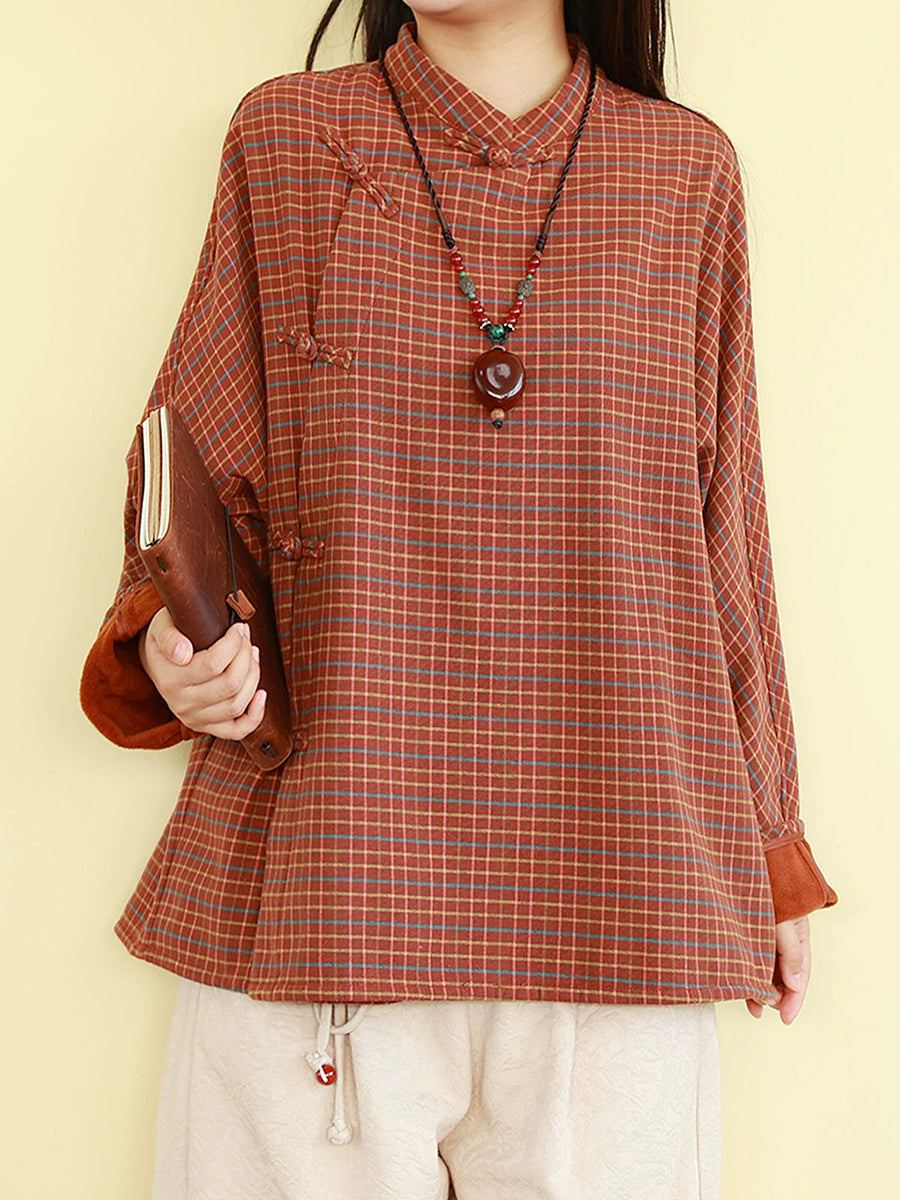 Kvinnors vinterblus med etnisk rutig stående krage och fleecefodrad