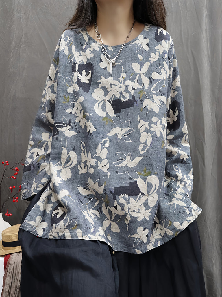 Dam Höstskjorta med vintagemotiv, 100 % linne och O-ringning