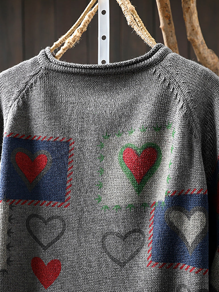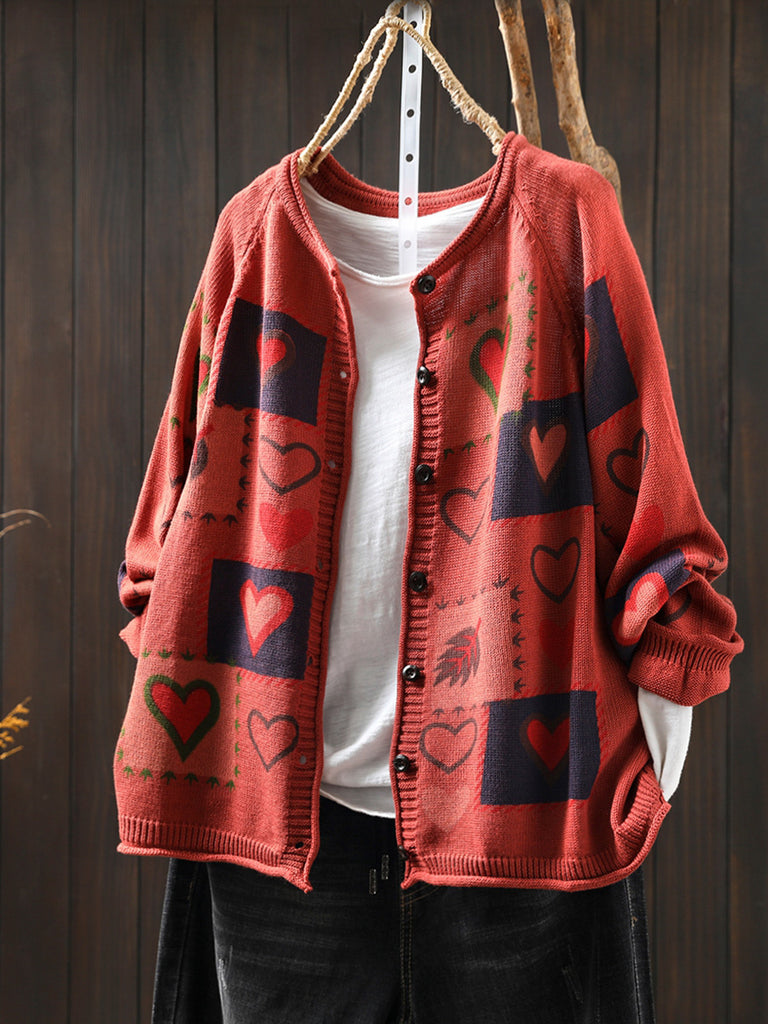 Sommar Artsy Heart Button-up Stickad O-ringad T-shirt för Kvinnor