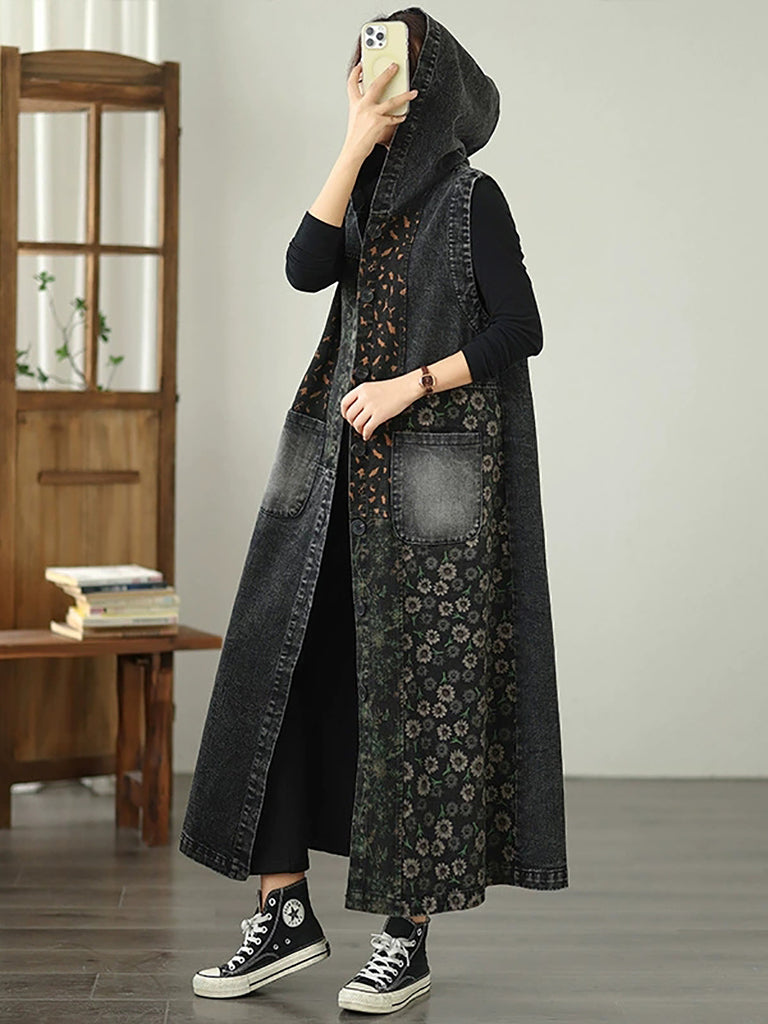 Dam Vintage Denim Blommig Spliced Hooded Vest Coat