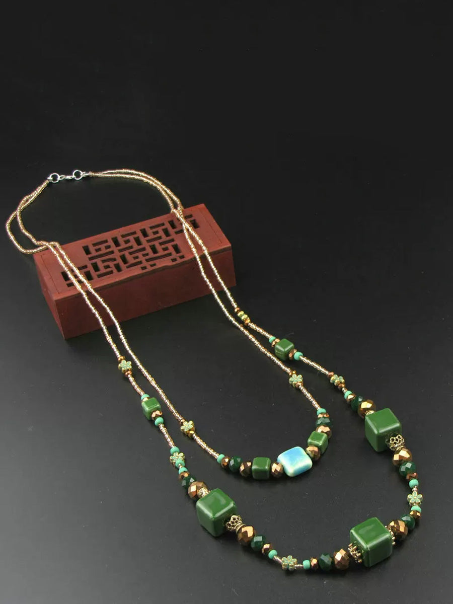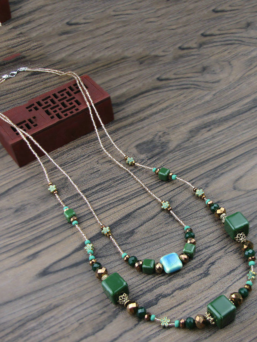 Halsband med gröna keramiska pärlor i vintage-stil för kvinnor