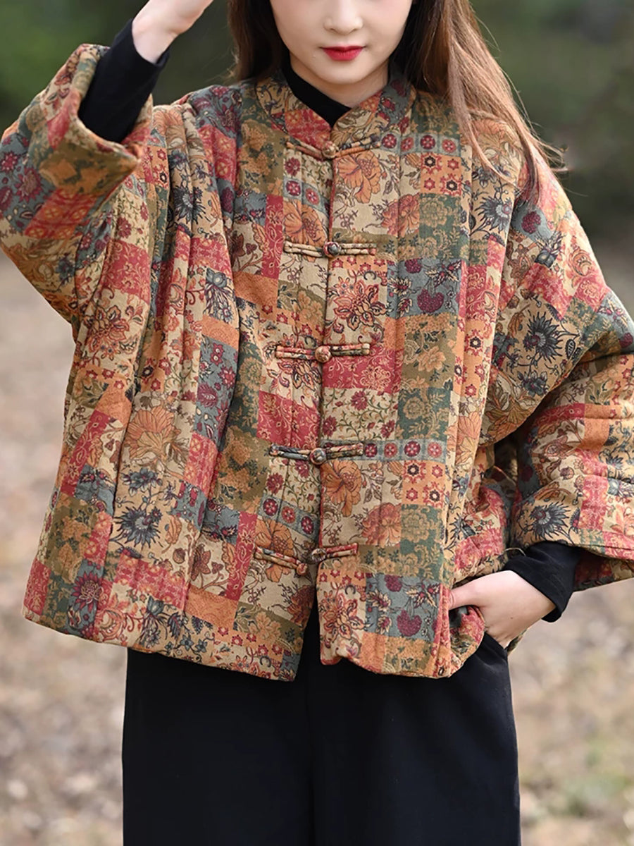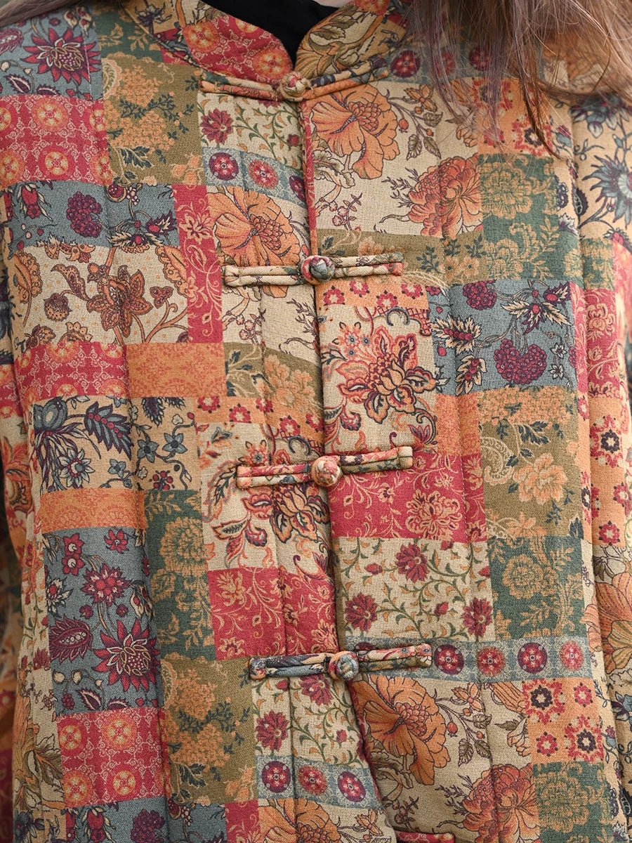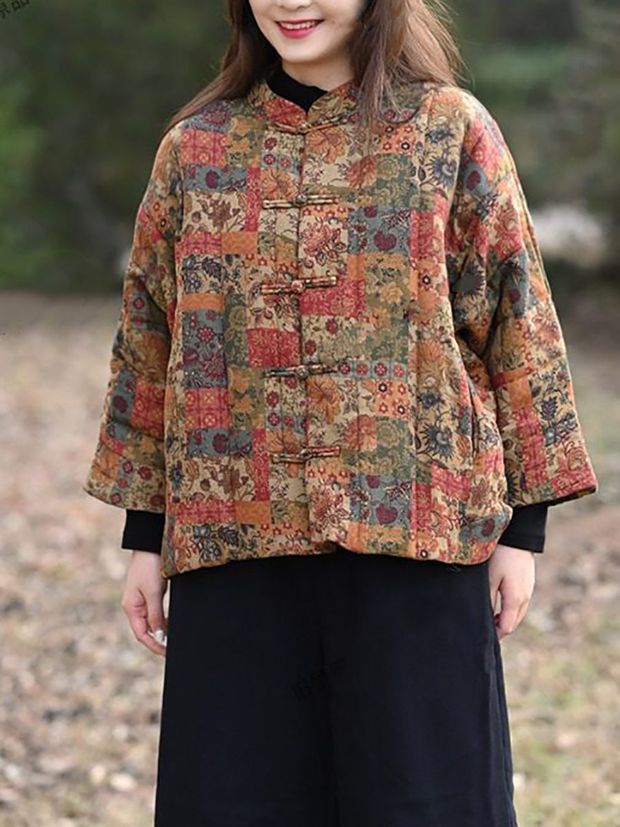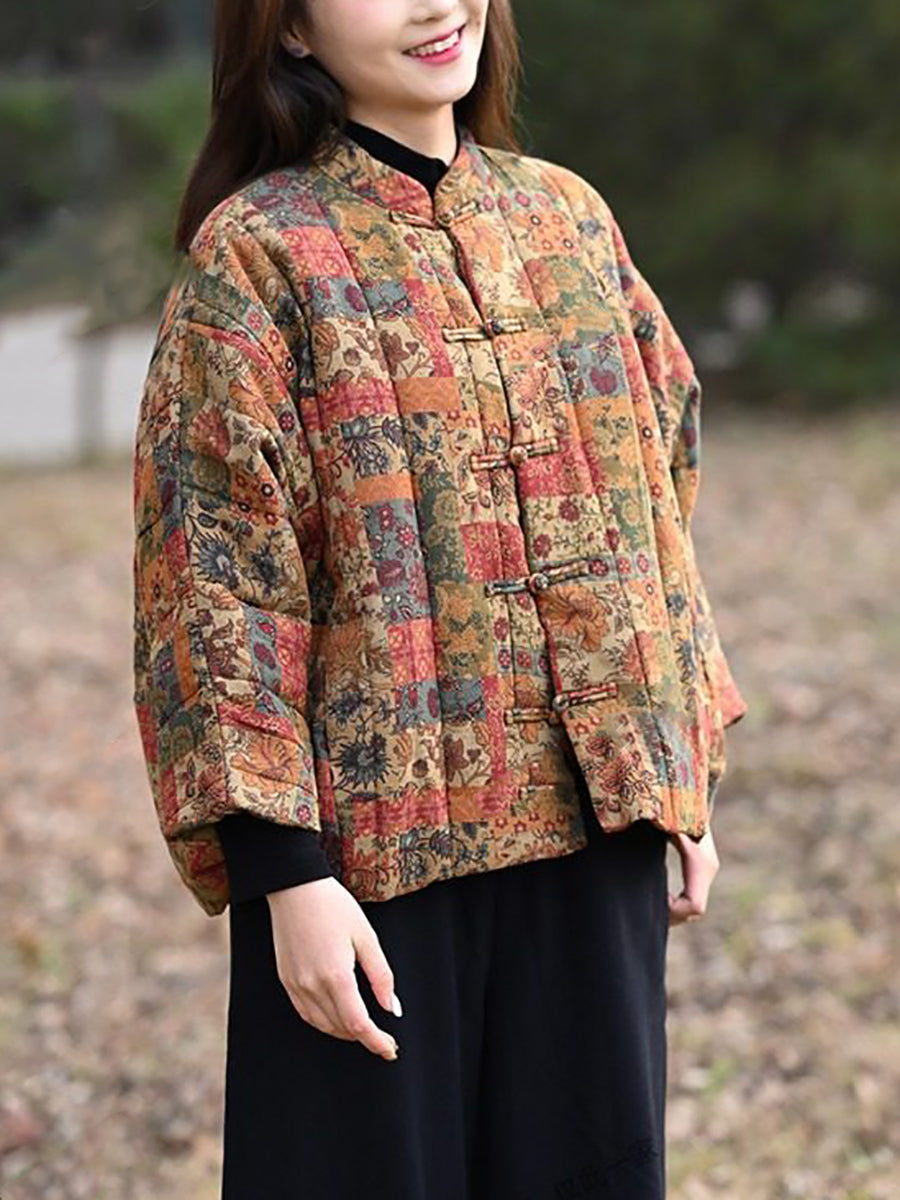 Kvinnors vinterblommiga lapptäcke med ståkrage vadderad kappa