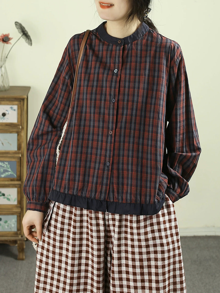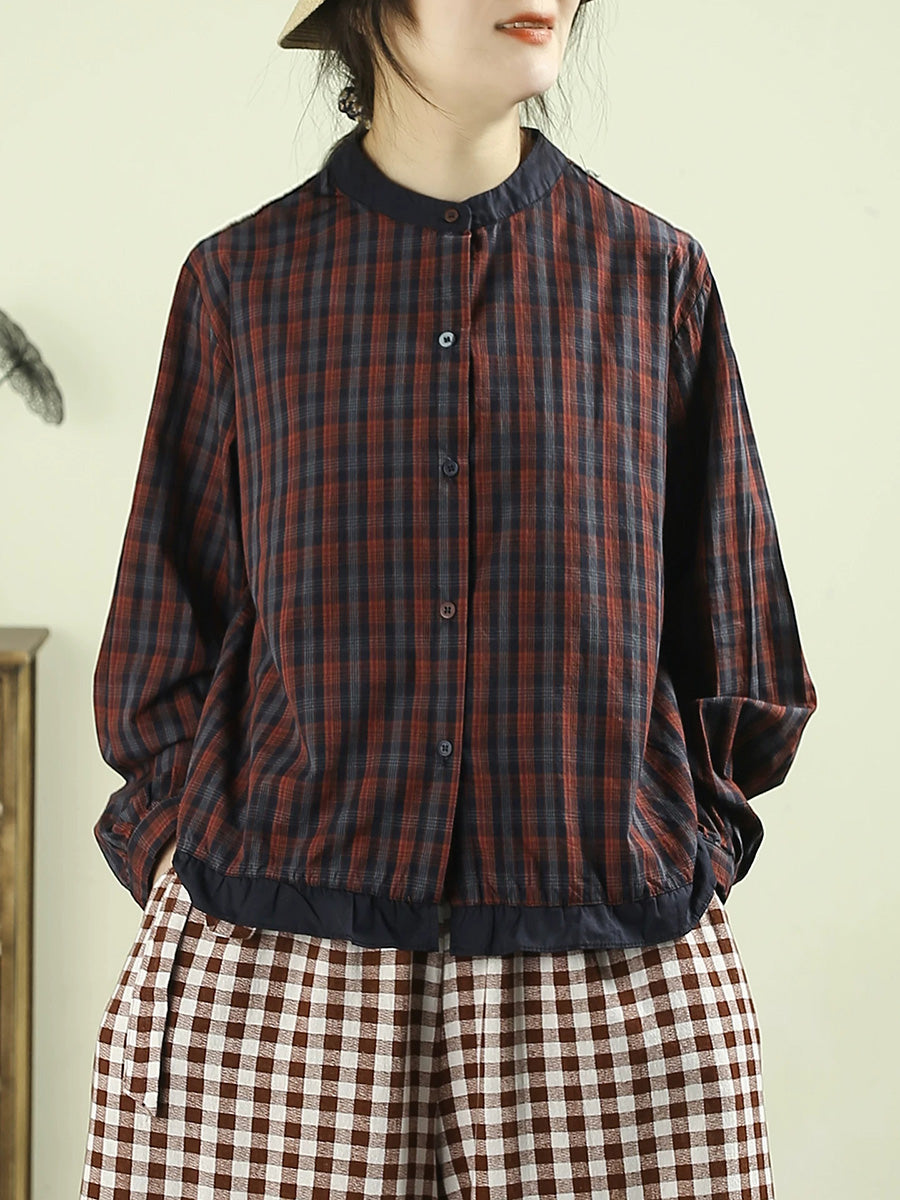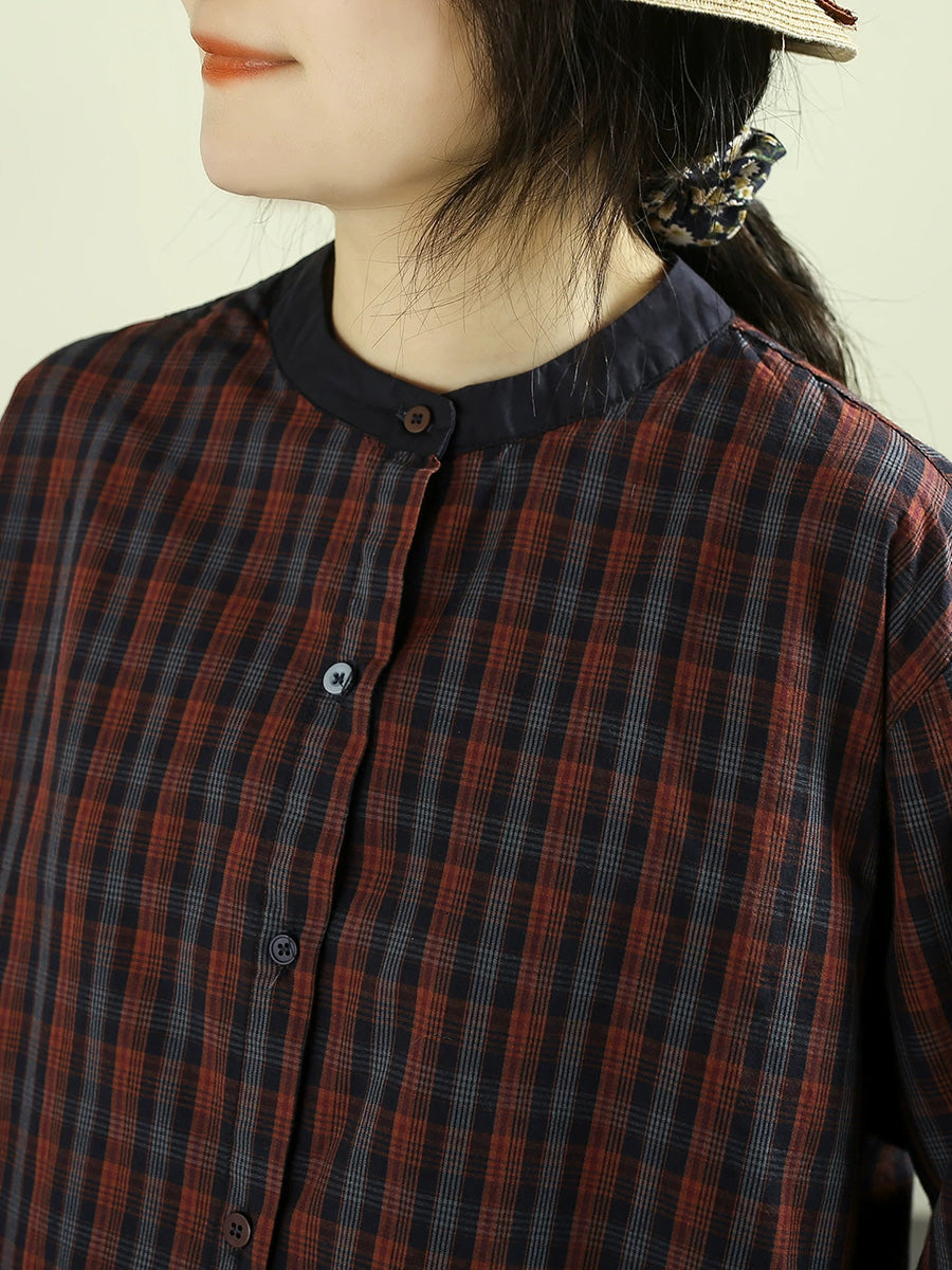女士春季復古格紋100%純棉立領襯衫